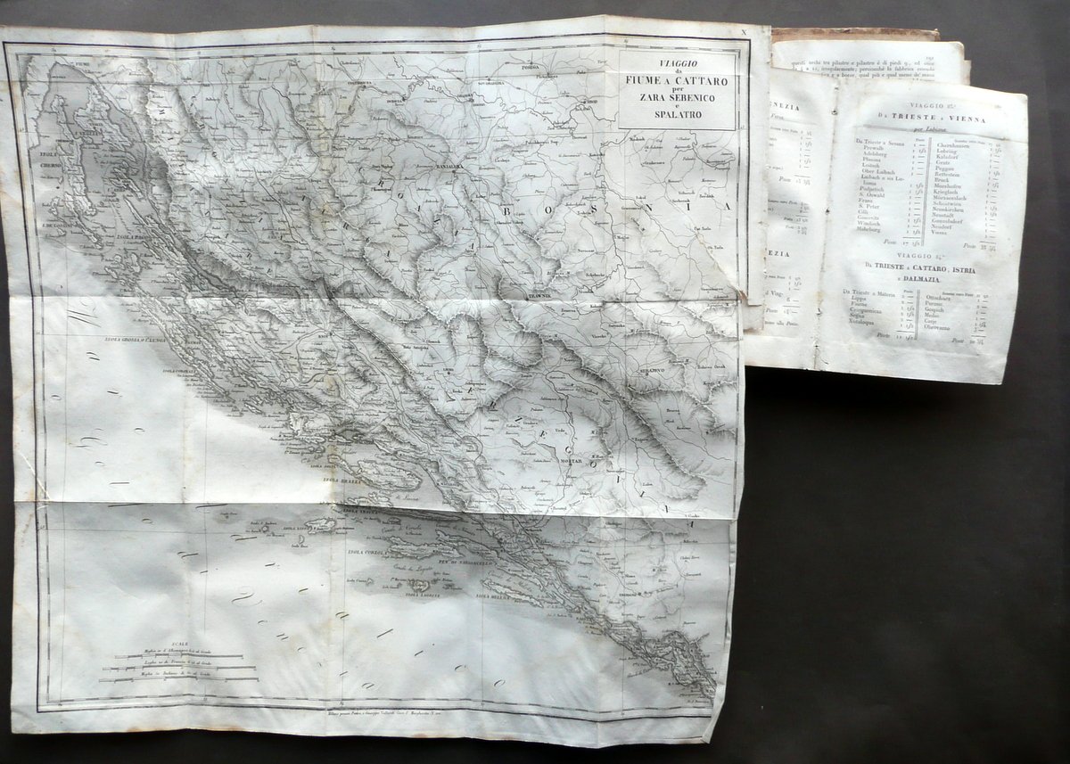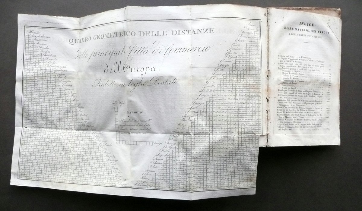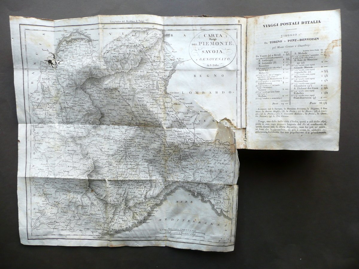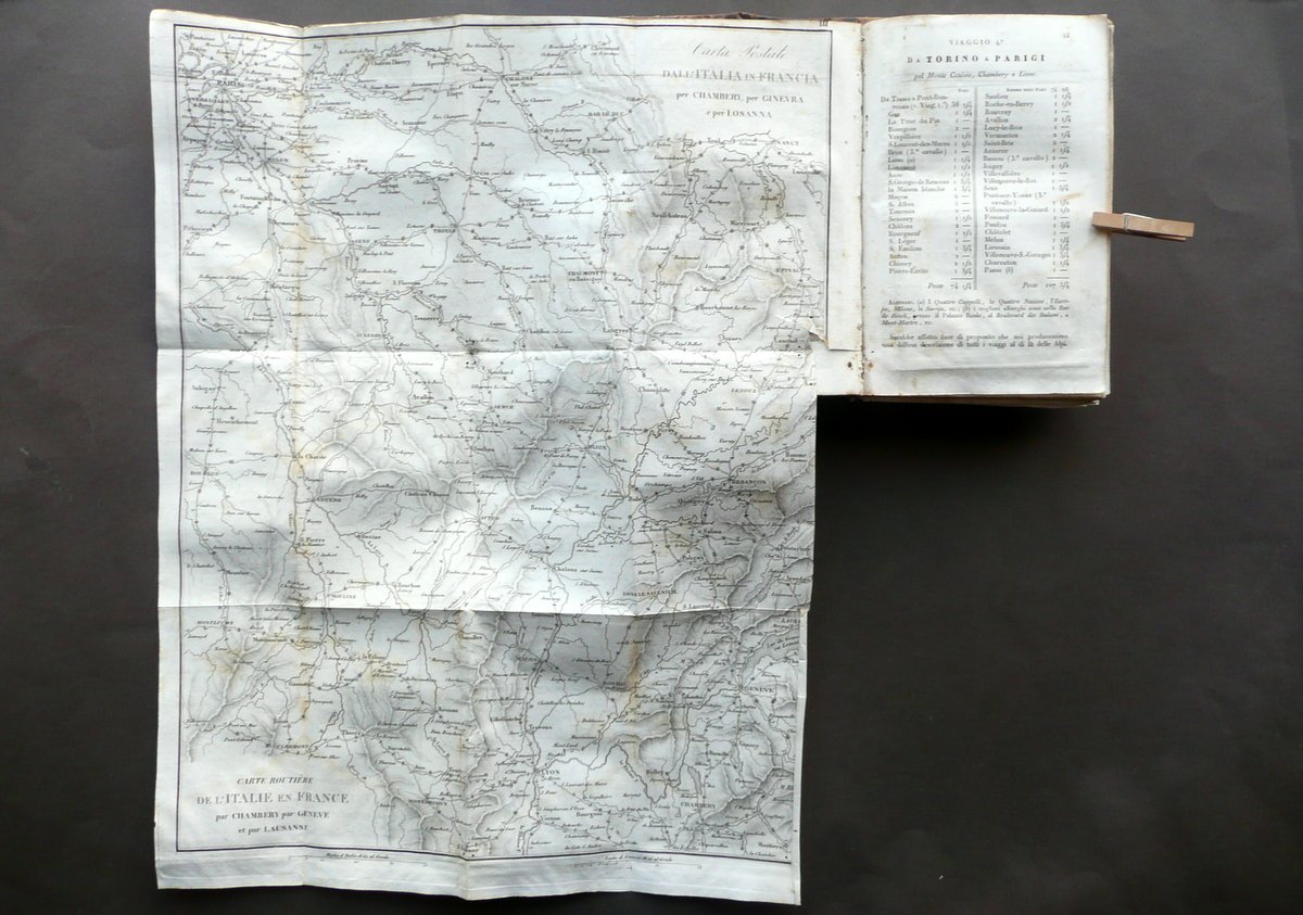 Giuseppe Vallardi, † Itinerario d'Italia o sia descrizione di CXXXVI [136] Viaggi per le strade pi˘ frequentate sÏ per posta che altrimenti alle Principali citt‡ d'Italia Coll'indicazione delle distanze, dei migliori alberghi, degli oggetti pi˘ interessanti di Belle Arti, Antiquarioa e Storia Naturale, delle principali produzioni e manifatture locali, ecc.†ecc. [.] Presso Pietro e Giuseppe Vallardi, Milano 1835, cm 18,5x12, pp. XCII; 370, con 11 carte in b/n rip. pi˘ volte fuori t. (presenti 11 carte sulle 15 totali); legatura d'epoca in mezza pelle con titolo e alcuni fregi impressi in oro e in nero al dorso, piatti in carta marmorizzata. Cuffia inf. con applicato vecchio pecetto di archiviazione. Frontespizio con vecchio timbretto e qualche leggera annotazione numerica a matita (vedi foto). † Condizioni di conservazione Esemplare in discrete condizioni con tracce d'uso e leggeri segni del tempo; coperta con alcune piccole leggere abrasioni e qualche circoscritta mancanza; dorso con alcuni minimi forellini (danni da tarlo) che coinvolgono in misura minima e marginale i margini interni di alcune pagine, senza mai compromettere la lettura del testo. Interni complessivamente ben conservati, staccati dalla legatura e con lieve allentamento delle cuciture / distacco di qualche fascicolo e carta; alcune piccole leggere bruniture e qualche lieve ombra di gora, le quali non compromettono la lettura del testo; mancanza di quattro carte fuori testo (ne sono presenti 11 su 15). † Bella e dettagliata opera di viaggi, con numerose indicazioni anche delle varie stazioni di posta (vedi foto). Condizioni come da foto e da descrizione, legate all'uso e alla ripetuta consultazione durante i viaggi, nonchÈ alla prolungata esposizione sia ai fattori atmosferici che alle condizioni di trasporto. † SETT111.L10681 N