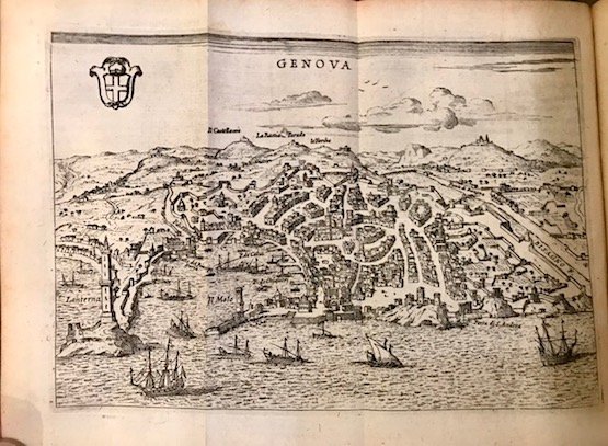 8vo (cm. 16,3), 8 cc.nn., 484 pp., 8 cc.nn. Antiporta allegorica e 26 tavv. calcografiche ripiegate f.t. Al frontespizio stemma della famiglia Borghese. Legatura coeva in piena pelle con nervi,fregi oro e titolo - non leggibile - impresso al ds. (difetti e piccole mancanze). Tagli rossi. Ex libris araldico ‘Giulio Gelardi’ al contropiatto anteriore. Ottimo esemplare. Le tavole - in perfette condizioni e nitidamente impresse - raffigurano l’Italia, Roma, Trento, Venezia, Padova, Vicenza, Verona, Brescia, Milano, Parma, Bologna, Firenze, Lucca, Livorno, Siena, Civitavecchia, Genova, Mantova, Ferrara, Urbino, Ancona, Loreto, Napoli, Pozzuoli, Bacoli e Cuma.