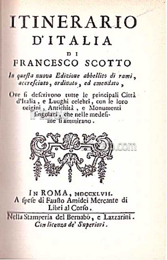 Itinerario d'Italia. In questa nuova edizione abbellito di rami, accreciuto, ordinato ed emendato, ove si descrivono tutte le principali città d'Italia e luoghi celebri con le loro origini, antichità e monumenti singolari che nelle medesime si ammirano