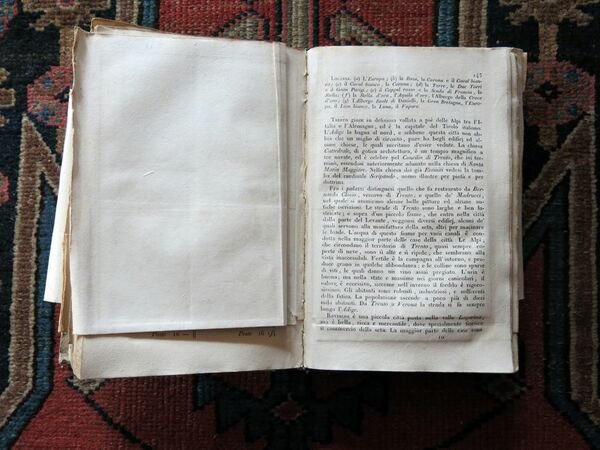 XXII edizione milanese nuovamente corretta ed accresciuta. Milano, Pietro e Giuseppe Vallardi, 1837. In 8vo, pp. XCII, 369 con indici, con 16 carte ripiegate f. t. (numerate in alto a destra con numeri romani), leg. in mz. pelle marrone con titolo e fregetti in oro al dorso, piatti in cartonato marmorizzato, tagli in pointellisme marrone. Sono riferiti gli oggetti più interessanti di belle arti, antiquaria e storia naturale, manifatture e produzioni dei vari luoghi, alberghi, cavalli, poste, moneta e altre notizie per i viaggiatori. Guida poco comune. Manca a Fossati - Bellani e Villa. Completo delle carte. Normali tracce alla legatura, per il resto esemplare fresco e in buono stato.