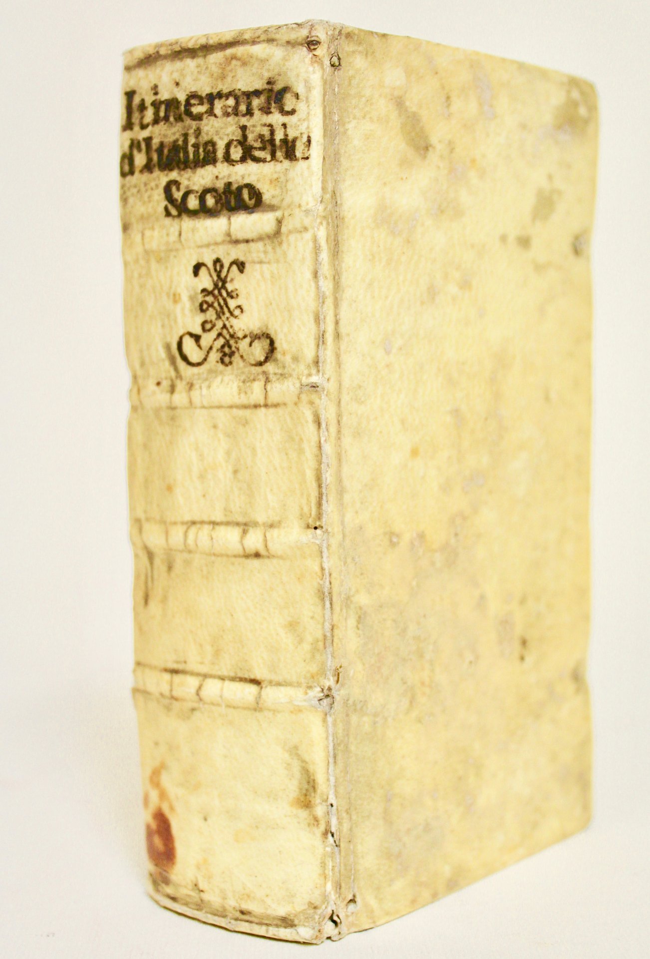 3 parti in un tomo in 12°(mm 150x73); pagg. (24), pagg. 706. Piccoli fregi, finalini ed iniziali ornate, tutto in silografia. Complessive 37 tavole incise finemente in rame ripiegate fuori testo, fra cui 1 carta geografica dell Italia. Pergamena flessibile coeva, titolo manoscritto al dorso con quattro nervi, tagli a spruzzo. Buona edizione di una delle più note descrizioni geografico-storico-artistico della penisola, originariamente pubblicata in latino nel 1600 e poi tradotta nel 1615 in italiano. La prima parte "Descrizione dell'Italia in generale" riguarda prevalentemente il nord ma anche Toscana e centro Italia con relative tavole; la seconda parte è la "Descrittione di Roma"; la terza parte è "Viaggio da Roma à Napoli e Sicilia". Nell'opera le vedute prospettiche raffigurano: Trento, Treviso, Venezia, Padova, Vicenza, Verona, Brescia, Milano, Lago di Como, Cremona, Pavia, Parma, Reggio Emilia, Bologna, Firenze, Siena, Mantova, Ferrara, Rimini, Ancona, Loreto, Lucca, Genova, Udine, Roma, Terracina, Fondi, Gaeta, Napoli, Pozzuoli, Tivoli, Messina, Catania, Palermo, Malta, Lazio. Esemplare bello con minime tracce del tempo alla legatura; piccoli restauri al margine interno del frontespizio . Cremonini, 66; Fossati Bellani, 301. <BR>