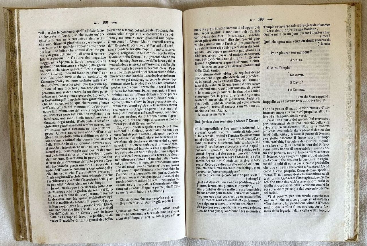 Edizione italiana del 1844 di questa opera di viaggio dello scrittore politico diplomatico e storico francese Francois Renè de Chateaubriand (1768-1848). Nell'anno 1806 intraprese un viaggio per concretizzare il progetto letterario di una epopea cristiana: attraversò la Grecia, Asia Minore, Palestina, Egitto fino ad arrivare in Spagna. Gli appunti che raccolse durante il viaggio vennero elaborati nell'opera "L'itinerarire de Paris a Jerusalem", pubblicata per la prima volta nel 1811. In ottime condizioni. Copertina in pergamena coeva con titolo in oro al dorso in buone condizioni generali con lievi usure ai margini e dorso. Legatura in buone condizioni. Pagine in buone condizioni con rare fioriture. In 8. Cm 22,5x16,5. Pp. 280. Italian edition of 1844 of this work of travel byt he french writer politician diplomat and hystorian Francois Renè de Chateaubriand (1768-1848). During the year 1806 he made a travel for the literary project of a christian epopea: he went through Greece, Asia Minore, Palestine, Egypt to get to Spain. The notes collected during the travel were elaborated in the work "L'itinerarire de Paris a Jerusalem", published for the first time in 1811. In very good conditions. Parchment coeval cover with gilted title in the spine in good general conditions lightly worn in the extremities. Binding in good conditions. Pages in good conditions with occasional foxing. In 8. Cm 22,5x16,5. Pp. 280.<BR><BR> <BR><BR> <BR><BR> <BR><BR><BR>