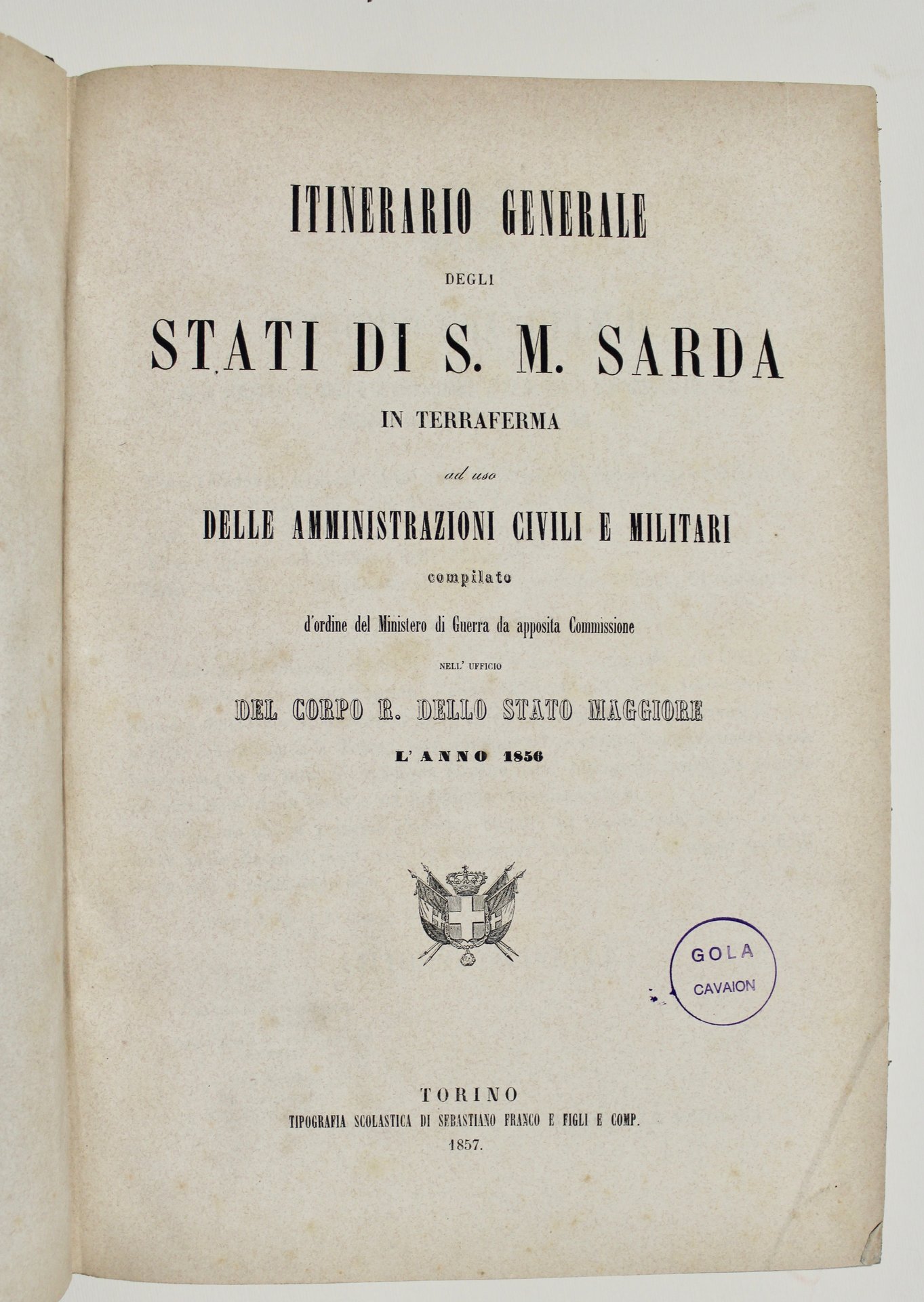 ITINERARIO GENERALE DEGLI STATI DI S. M. SARDA IN TERRAFERMA AD USO DELLE AMMINISTRAZIONI CIVILI E MILITARI COMPILATO D'ORDINE DEL MINISTERO DI GUERRA DA APPOSITA COMMISSIONE. L'ANNO 1856.