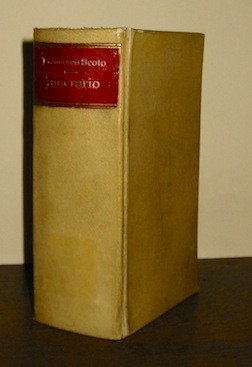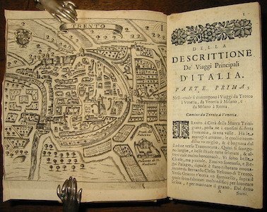 12mo (cm. 13,6), 12 cc.nn., 706 pp. con 36 (di 37) tavv. ripiegate f.t. Graziosa vignetta xilografica raffigurante la città di Venezia al frontespizio. L’opera è divisa in tre Parti. Solida legatura più tarda in piena pergamena con titolo oro su tassello in pelle rossa al ds. Assente la sola pianta di Cremona. Frontespizio con tracce d’usura e piccola mancanza al margine inferiore. Buon esemplare. Cremonini, p. 52 (con 36 tavole, non cita la carta dell’Italia). Altre edizioni in Fossati Bellani e Vinciana. Nell’opera sono descritte e raffigurate con piante di città, vedute a volo d’uccello o carte geografiche le seguenti località: Italia, Trento, Treviso, Venezia, Padova, Vicenza, Verona, Brescia, Milano, Lago di Como, Pavia, Parma, Reggio Emilia, Bologna, Firenze, Siena, Mantova, Ferrara, Rimini, Ancona, Loreto, Lucca, Genova, Udine, Roma, Terracina, Fondi, Gaeta, Napoli, Pozzuoli, Tivoli, Messina, Catania, Palermo, Malta, Lazio.
