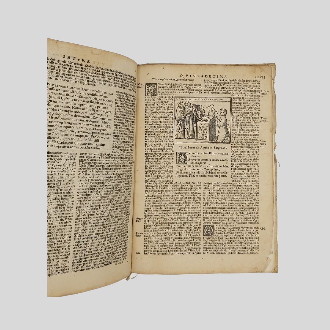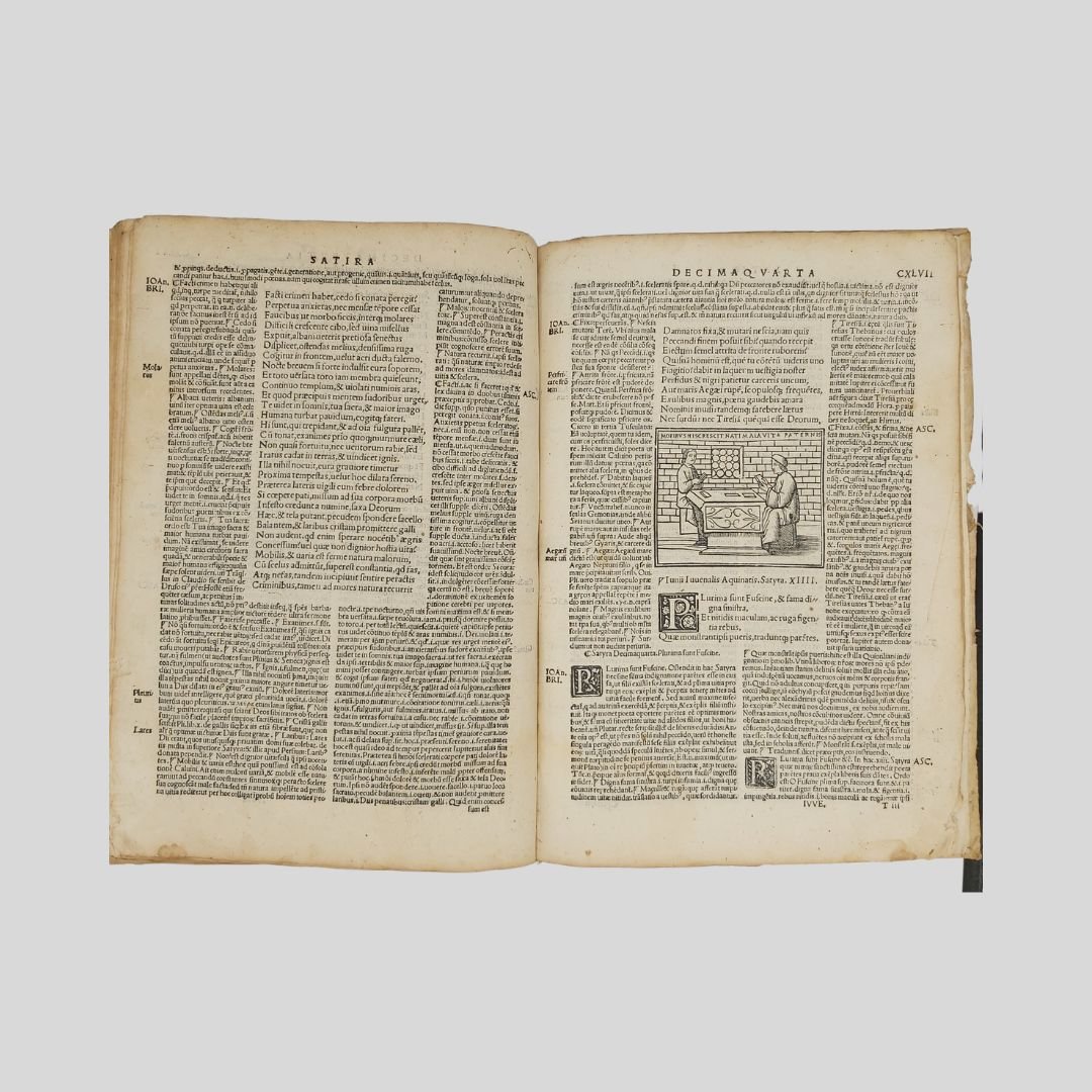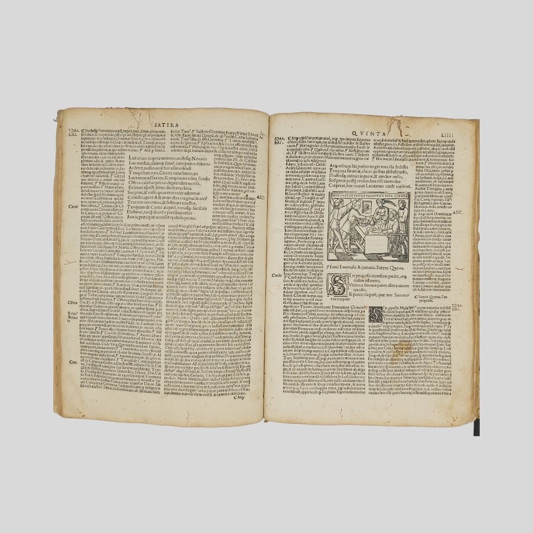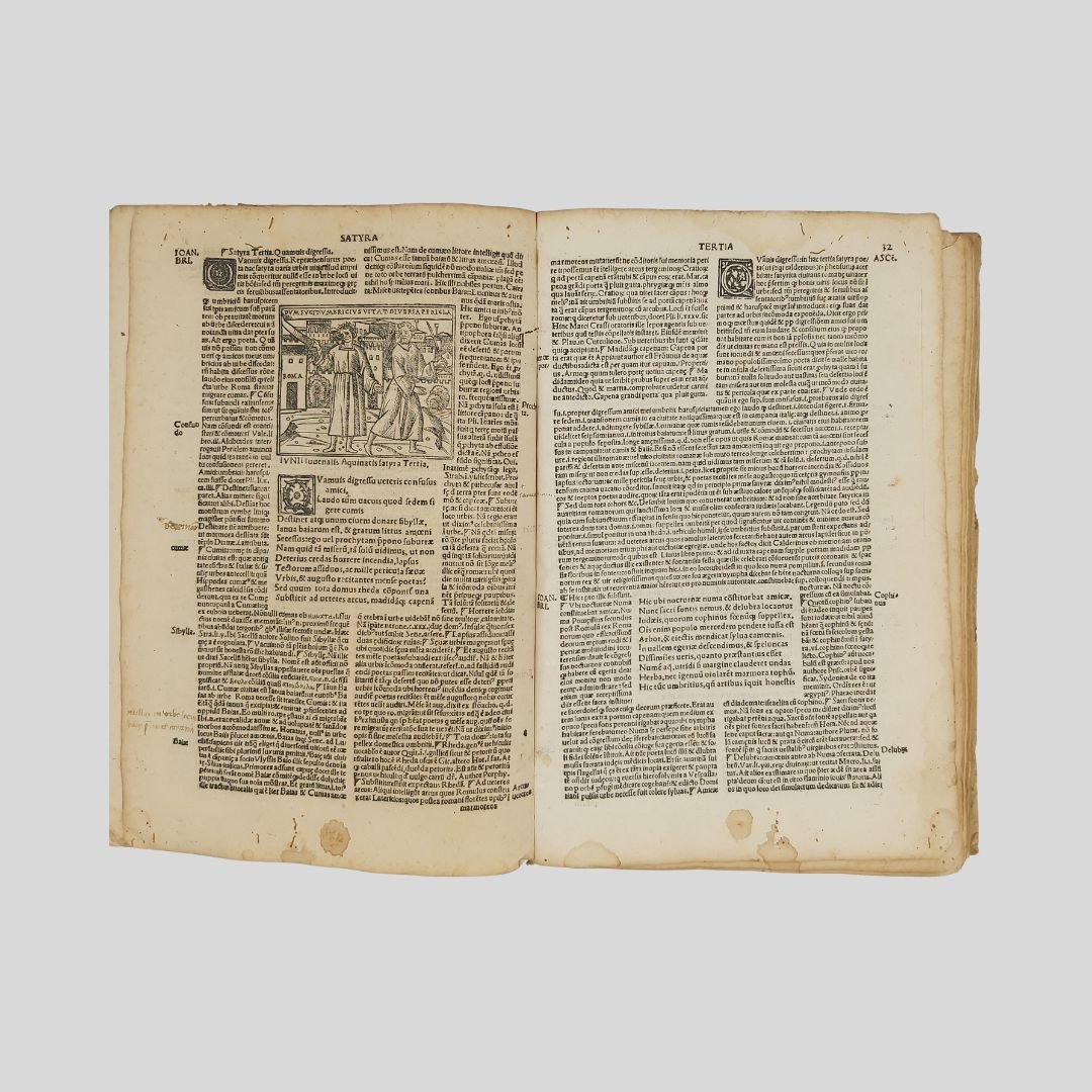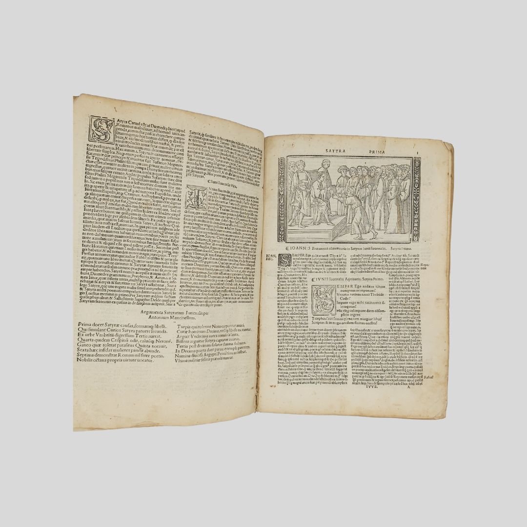 In-folio (mm 302×208). Carte [6], CLXIII, 1 b. Frontespizio in inchiostro rosso e nero, marca tipografica incisa in legno (san Giorgio e il drago) entro bella cornice xilografica a motivi fitomorfi, 16 graziose vignette incise in legno nel testo a illustrare ciascuna satira. Testo incorniciato dal commento. Nota di possesso sbiadita al front., piccola mancanza all’angolo inferiore, un buchetto che interessa anche le successive 5 carte non numerate. Alcuni passaggi di tarme ai margini bianchi superiori e inferiori, altri ai margini bianchi interni. Alcuni aloni di vecchia umidità. Sporadiche glosse ai margini. Rinforzi ai margini inferiori delle cc. LXXXVII e LXXXVIII. Due cc. bianche non impresse al verso della c. LXVII, ma esemplare completo di tutte le carte. Lieve perdita al margine inferiore. dell’ultima c. Legatura coeva in p. pergamena rimontata, piccole mancanze al dorso e ai margini dei piatti. Questa edizione delle Satire stampata dal Rusconi a Venezia si caratterizza per il commento di Giovanni Britannico (1462-1518)e di Badio Ascensio (1462-1535)e per l’apparato iconografico composto dall’elegante bordura della pagina del titolo, dalla vignetta di S. Giorgio e il drago sempre alla prima carta, dalle iniziali su fondo nero e dalle 15 grandi vignette (la settima è la medesima della sesta) con soggetti attinenti al testo, incise in legno sui modelli di gusto veneziano delle precedenti edizioni.<BR>Cfr. Choix 4719: «Cette édition a les mêmes figures que celle du 1515 sauf le premier bois qui est changé, et le 6e omis et remplacé par une répétition du 7e». Edit16 CNCE 30079. Il commento del Britannico (apparso per la prima volta nel 1501) “per tutto il secolo… [fu] preferito a quello di altri umanisti famosi” (DBIt XIV p. 342). Le Satire in esametri del poeta satirico Giovenale (55-135 d.C.) apparvero per la prima volta a Roma nel 1496 e conobbero un notevole successo editoriale. Le Satire di G. risultano essere terribilmente attuali. Ci ricorda che il passato è sempre stato molto meglio, ma che oggigiorno sono le persone sbagliate ad avere i soldi, i nuovi arrivati, gli immigrati, i trafficanti e gli affaristi politici, gli avvocati. La satira di Giovenale si aggrappa a problemi ricorrenti che ancora oggi colpiscono. Il satiro è razzista, omofobo e sessista…