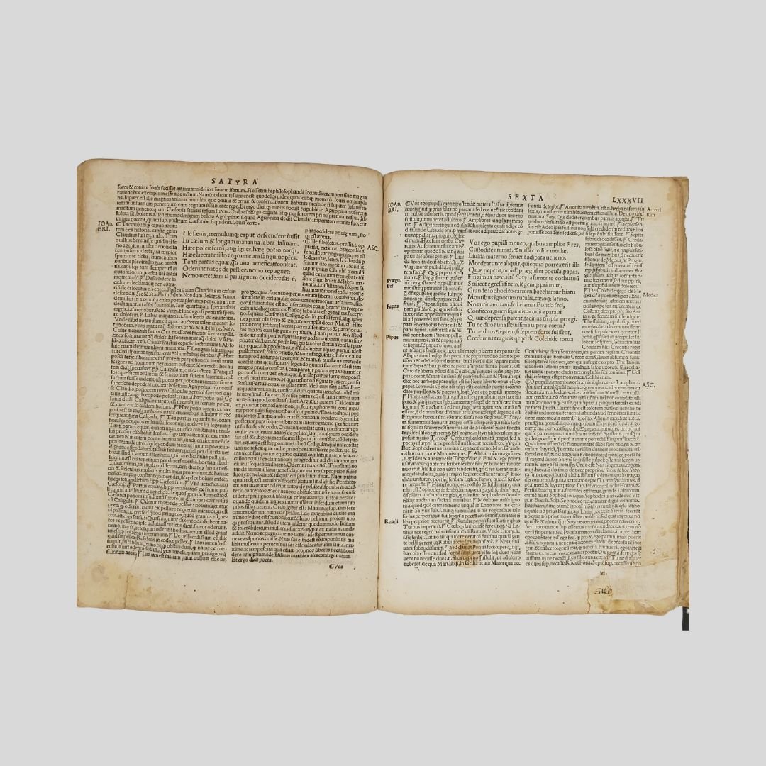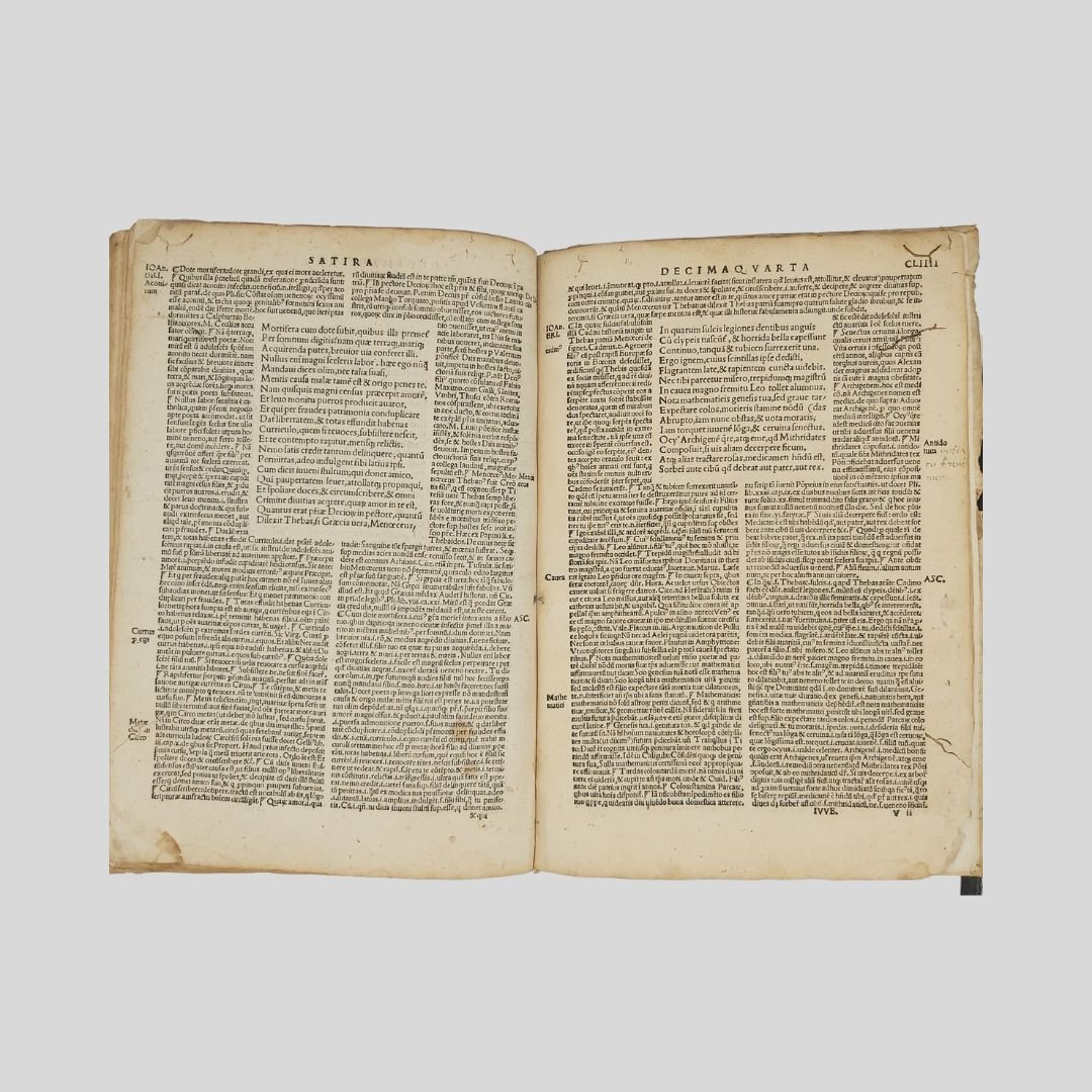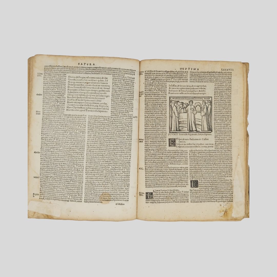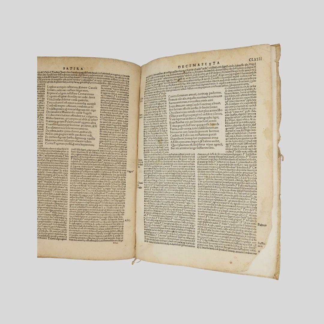 In-folio (mm 302×208). Carte [6], CLXIII, 1 b. Frontespizio in inchiostro rosso e nero, marca tipografica incisa in legno (san Giorgio e il drago) entro bella cornice xilografica a motivi fitomorfi, 16 graziose vignette incise in legno nel testo a illustrare ciascuna satira. Testo incorniciato dal commento. Nota di possesso sbiadita al front., piccola mancanza all’angolo inferiore, un buchetto che interessa anche le successive 5 carte non numerate. Alcuni passaggi di tarme ai margini bianchi superiori e inferiori, altri ai margini bianchi interni. Alcuni aloni di vecchia umidità. Sporadiche glosse ai margini. Rinforzi ai margini inferiori delle cc. LXXXVII e LXXXVIII. Due cc. bianche non impresse al verso della c. LXVII, ma esemplare completo di tutte le carte. Lieve perdita al margine inferiore. dell’ultima c. Legatura coeva in p. pergamena rimontata, piccole mancanze al dorso e ai margini dei piatti. Questa edizione delle Satire stampata dal Rusconi a Venezia si caratterizza per il commento di Giovanni Britannico (1462-1518)e di Badio Ascensio (1462-1535)e per l’apparato iconografico composto dall’elegante bordura della pagina del titolo, dalla vignetta di S. Giorgio e il drago sempre alla prima carta, dalle iniziali su fondo nero e dalle 15 grandi vignette (la settima è la medesima della sesta) con soggetti attinenti al testo, incise in legno sui modelli di gusto veneziano delle precedenti edizioni.<BR>Cfr. Choix 4719: «Cette édition a les mêmes figures que celle du 1515 sauf le premier bois qui est changé, et le 6e omis et remplacé par une répétition du 7e». Edit16 CNCE 30079. Il commento del Britannico (apparso per la prima volta nel 1501) “per tutto il secolo… [fu] preferito a quello di altri umanisti famosi” (DBIt XIV p. 342). Le Satire in esametri del poeta satirico Giovenale (55-135 d.C.) apparvero per la prima volta a Roma nel 1496 e conobbero un notevole successo editoriale. Le Satire di G. risultano essere terribilmente attuali. Ci ricorda che il passato è sempre stato molto meglio, ma che oggigiorno sono le persone sbagliate ad avere i soldi, i nuovi arrivati, gli immigrati, i trafficanti e gli affaristi politici, gli avvocati. La satira di Giovenale si aggrappa a problemi ricorrenti che ancora oggi colpiscono. Il satiro è razzista, omofobo e sessista…
