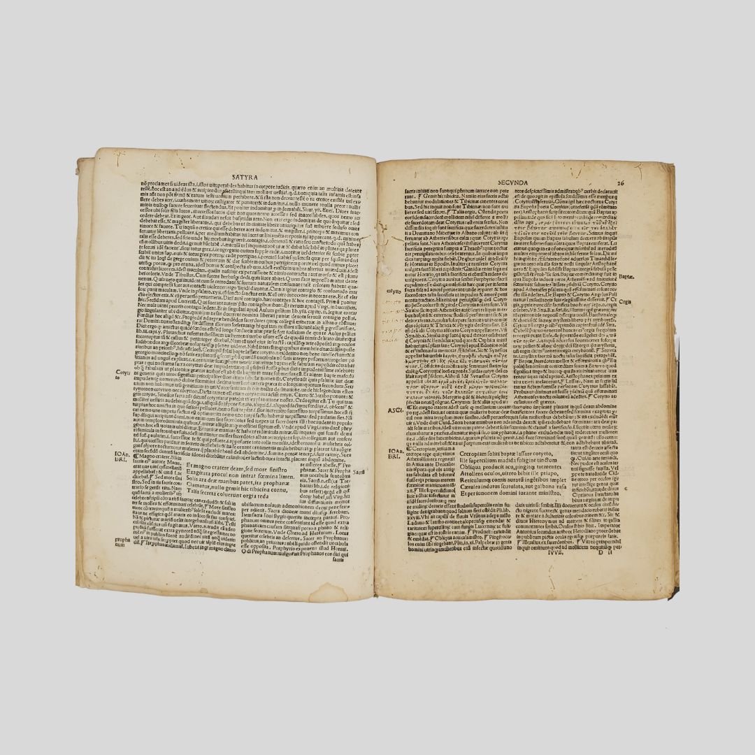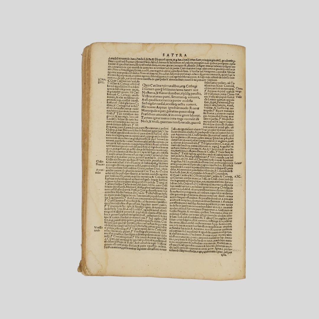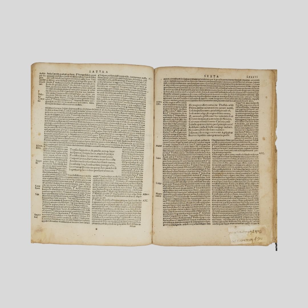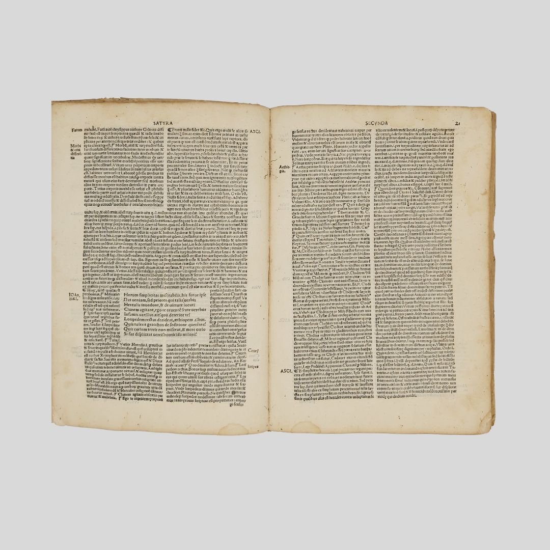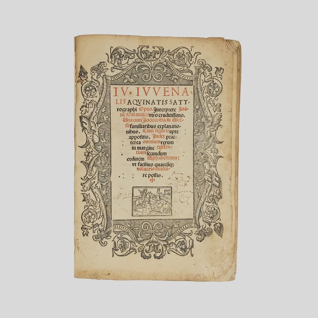 In-folio (mm 302×208). Carte [6], CLXIII, 1 b. Frontespizio in inchiostro rosso e nero, marca tipografica incisa in legno (san Giorgio e il drago) entro bella cornice xilografica a motivi fitomorfi, 16 graziose vignette incise in legno nel testo a illustrare ciascuna satira. Testo incorniciato dal commento. Nota di possesso sbiadita al front., piccola mancanza all’angolo inferiore, un buchetto che interessa anche le successive 5 carte non numerate. Alcuni passaggi di tarme ai margini bianchi superiori e inferiori, altri ai margini bianchi interni. Alcuni aloni di vecchia umidità. Sporadiche glosse ai margini. Rinforzi ai margini inferiori delle cc. LXXXVII e LXXXVIII. Due cc. bianche non impresse al verso della c. LXVII, ma esemplare completo di tutte le carte. Lieve perdita al margine inferiore. dell’ultima c. Legatura coeva in p. pergamena rimontata, piccole mancanze al dorso e ai margini dei piatti. Questa edizione delle Satire stampata dal Rusconi a Venezia si caratterizza per il commento di Giovanni Britannico (1462-1518)e di Badio Ascensio (1462-1535)e per l’apparato iconografico composto dall’elegante bordura della pagina del titolo, dalla vignetta di S. Giorgio e il drago sempre alla prima carta, dalle iniziali su fondo nero e dalle 15 grandi vignette (la settima è la medesima della sesta) con soggetti attinenti al testo, incise in legno sui modelli di gusto veneziano delle precedenti edizioni.<BR>Cfr. Choix 4719: «Cette édition a les mêmes figures que celle du 1515 sauf le premier bois qui est changé, et le 6e omis et remplacé par une répétition du 7e». Edit16 CNCE 30079. Il commento del Britannico (apparso per la prima volta nel 1501) “per tutto il secolo… [fu] preferito a quello di altri umanisti famosi” (DBIt XIV p. 342). Le Satire in esametri del poeta satirico Giovenale (55-135 d.C.) apparvero per la prima volta a Roma nel 1496 e conobbero un notevole successo editoriale. Le Satire di G. risultano essere terribilmente attuali. Ci ricorda che il passato è sempre stato molto meglio, ma che oggigiorno sono le persone sbagliate ad avere i soldi, i nuovi arrivati, gli immigrati, i trafficanti e gli affaristi politici, gli avvocati. La satira di Giovenale si aggrappa a problemi ricorrenti che ancora oggi colpiscono. Il satiro è razzista, omofobo e sessista…