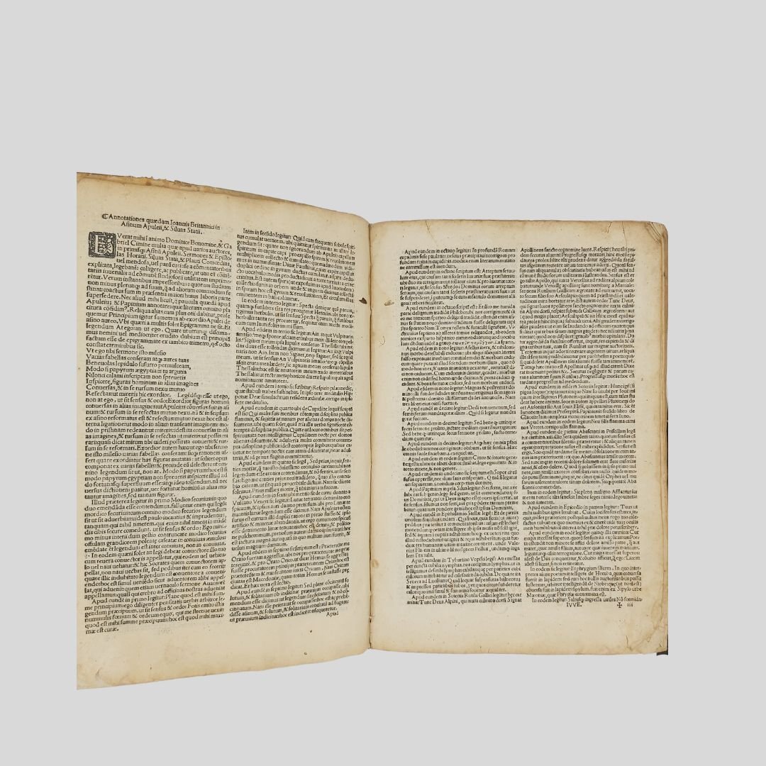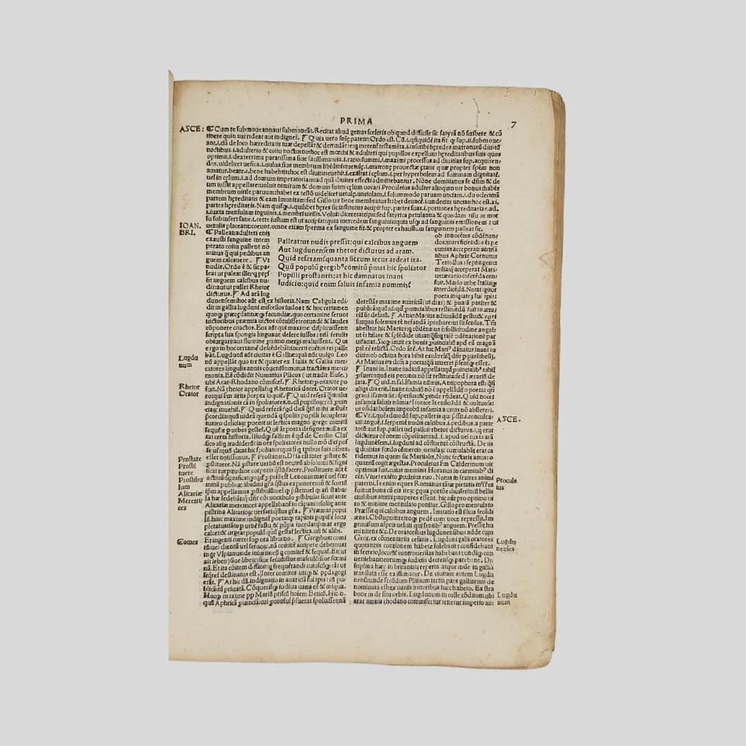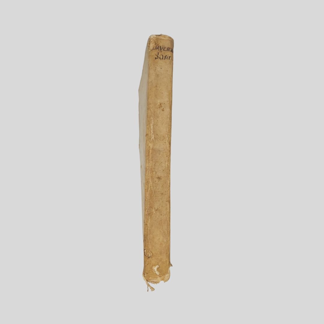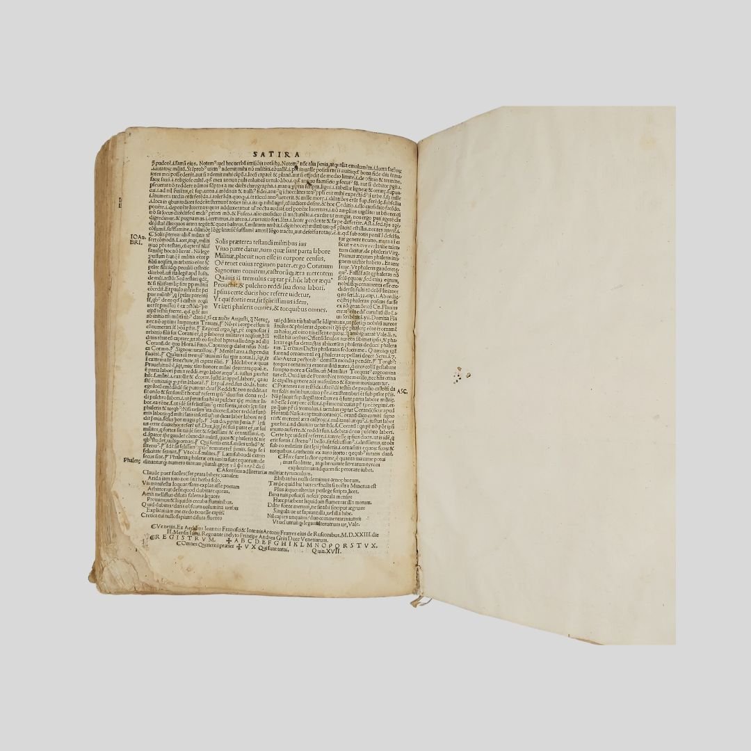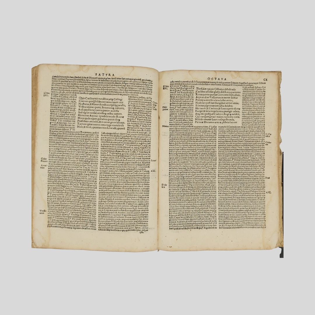 In-folio (mm 302×208). Carte [6], CLXIII, 1 b. Frontespizio in inchiostro rosso e nero, marca tipografica incisa in legno (san Giorgio e il drago) entro bella cornice xilografica a motivi fitomorfi, 16 graziose vignette incise in legno nel testo a illustrare ciascuna satira. Testo incorniciato dal commento. Nota di possesso sbiadita al front., piccola mancanza all’angolo inferiore, un buchetto che interessa anche le successive 5 carte non numerate. Alcuni passaggi di tarme ai margini bianchi superiori e inferiori, altri ai margini bianchi interni. Alcuni aloni di vecchia umidità. Sporadiche glosse ai margini. Rinforzi ai margini inferiori delle cc. LXXXVII e LXXXVIII. Due cc. bianche non impresse al verso della c. LXVII, ma esemplare completo di tutte le carte. Lieve perdita al margine inferiore. dell’ultima c. Legatura coeva in p. pergamena rimontata, piccole mancanze al dorso e ai margini dei piatti. Questa edizione delle Satire stampata dal Rusconi a Venezia si caratterizza per il commento di Giovanni Britannico (1462-1518)e di Badio Ascensio (1462-1535)e per l’apparato iconografico composto dall’elegante bordura della pagina del titolo, dalla vignetta di S. Giorgio e il drago sempre alla prima carta, dalle iniziali su fondo nero e dalle 15 grandi vignette (la settima è la medesima della sesta) con soggetti attinenti al testo, incise in legno sui modelli di gusto veneziano delle precedenti edizioni.<BR>Cfr. Choix 4719: «Cette édition a les mêmes figures que celle du 1515 sauf le premier bois qui est changé, et le 6e omis et remplacé par une répétition du 7e». Edit16 CNCE 30079. Il commento del Britannico (apparso per la prima volta nel 1501) “per tutto il secolo… [fu] preferito a quello di altri umanisti famosi” (DBIt XIV p. 342). Le Satire in esametri del poeta satirico Giovenale (55-135 d.C.) apparvero per la prima volta a Roma nel 1496 e conobbero un notevole successo editoriale. Le Satire di G. risultano essere terribilmente attuali. Ci ricorda che il passato è sempre stato molto meglio, ma che oggigiorno sono le persone sbagliate ad avere i soldi, i nuovi arrivati, gli immigrati, i trafficanti e gli affaristi politici, gli avvocati. La satira di Giovenale si aggrappa a problemi ricorrenti che ancora oggi colpiscono. Il satiro è razzista, omofobo e sessista…