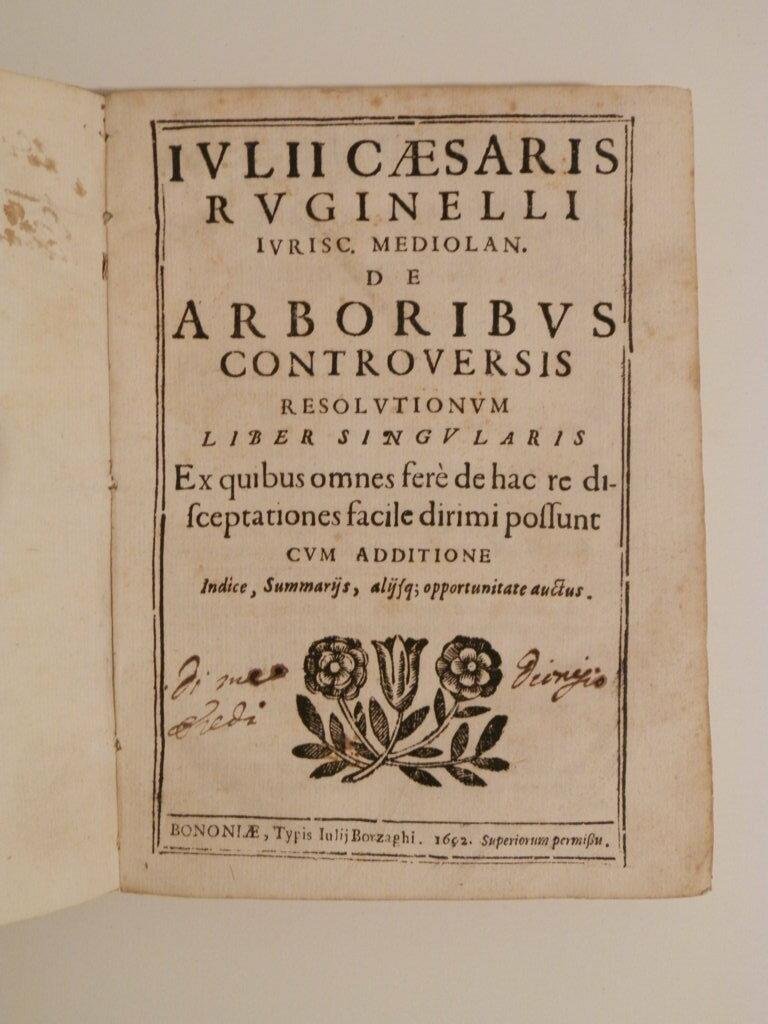 Iulii Caesaris Ruginelli ... De arboribus controversis resolutionum liber singularis ex quibus omnes fere de hac re disceptationes facile dirimi possunt cum additione indice, summarijs, alijsque opportunitate auctus