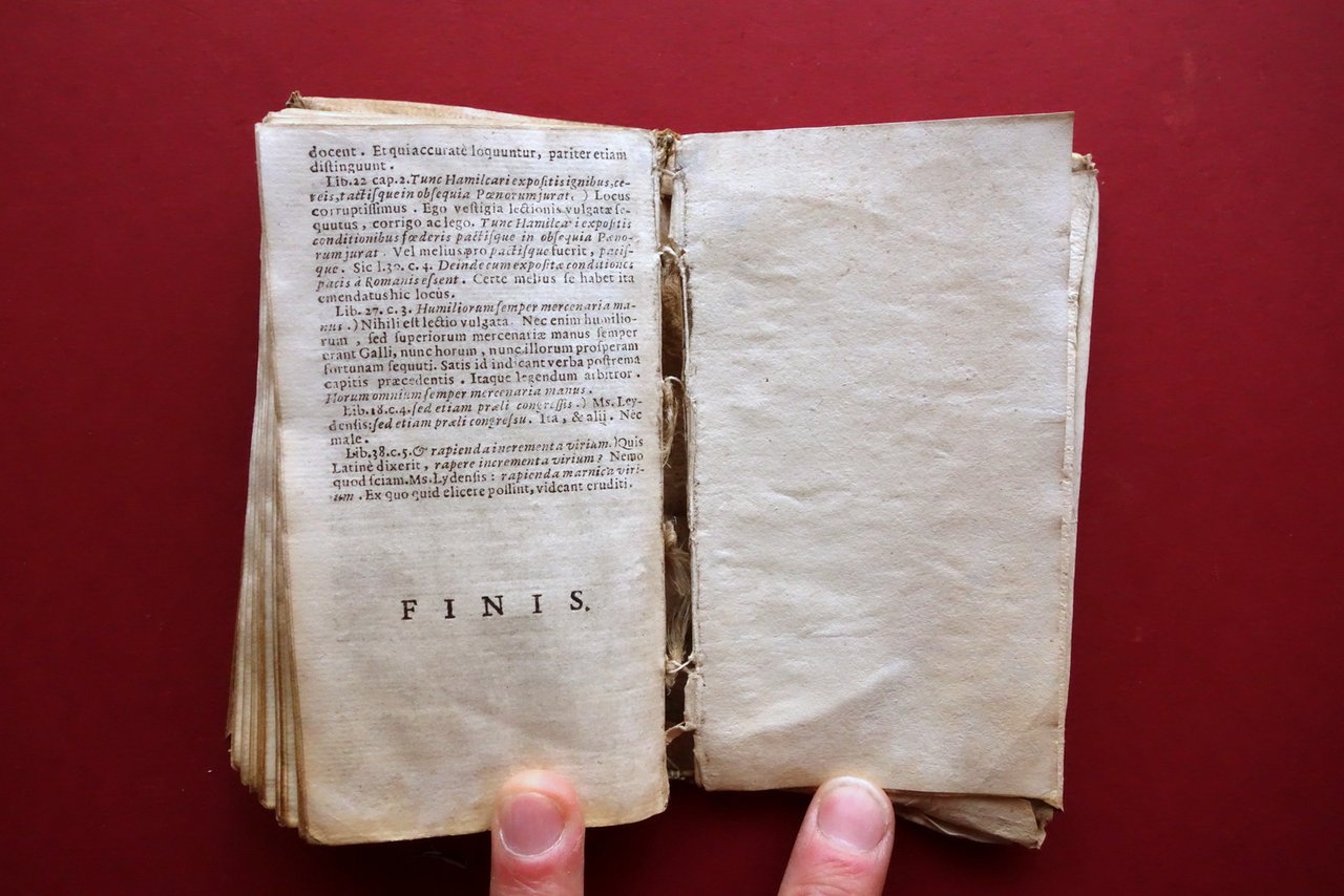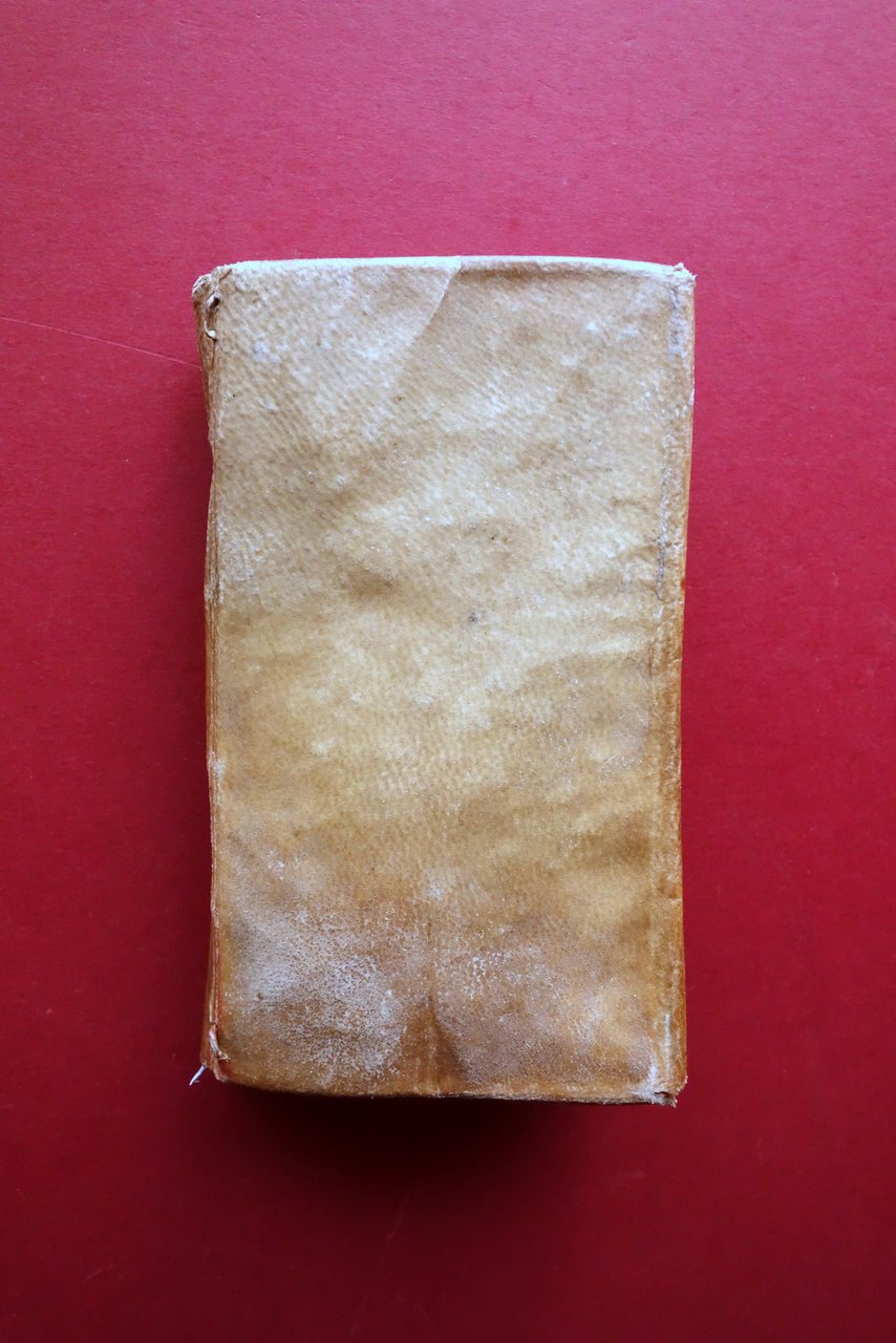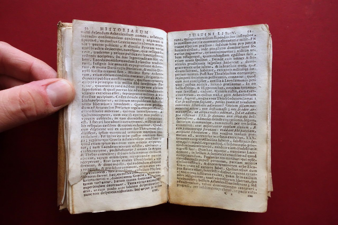 Settecentina, Iustini Historiarum ex Pompeio Trogo Lib. XLIV Apud Nicolaum Pezzana, Venetiis 1725; cm 13,5x7,5; pp. 260-[4]; bel frontespizio inc. in b/n, parzialmente acquerellato (colorazione d'epoca); legatura d'epoca in piena pergamena con titolo annotato al dorso. Condizioni di conservazione Condizioni discrete con tracce d'uso e del tempo; coperta con irregolarità, alcuni aloni e minimi accenni di sporco. Cerniere interne leggermente aperte con conseguente minimo allentamento delle cuciture dei fascicoli; margine inferiore delle pp. 49-50 con una mancanza di alcuni cm e conseguente piccola perdita di testo (vedi foto). Esemplare che presenta alcune leggere ondulazioni dovute a prolungata esposizione a fonte di umidità. SETT158.L25061 N P
