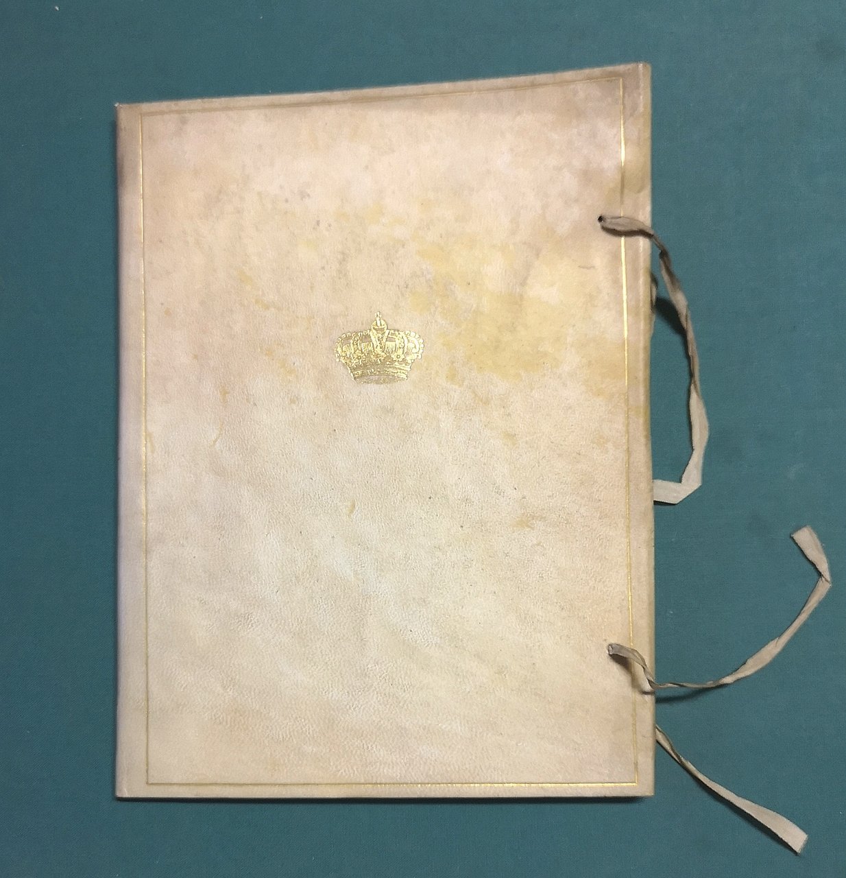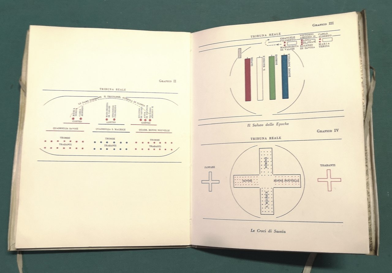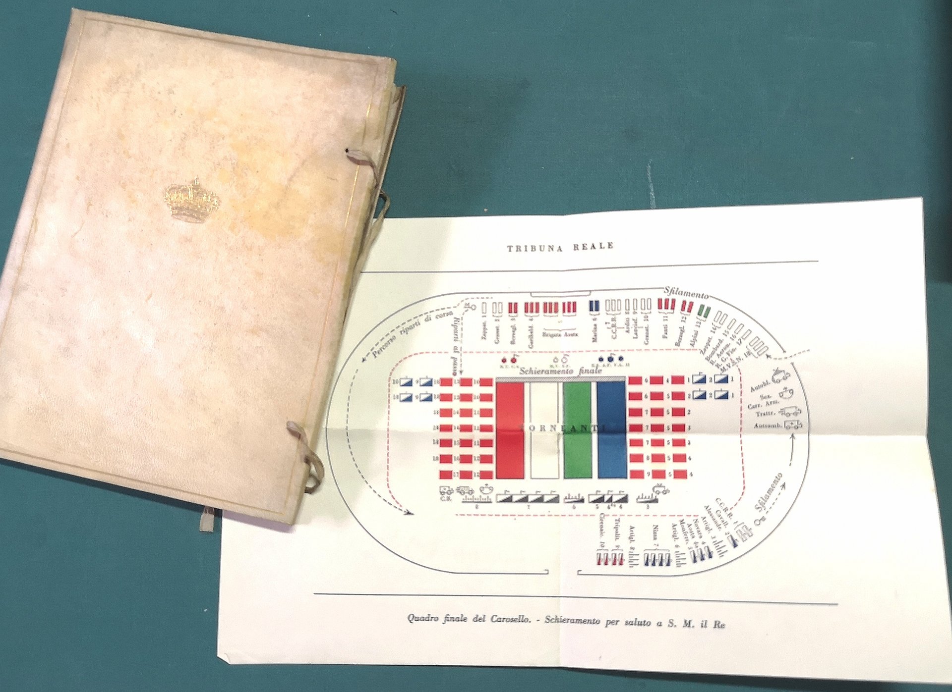 >in-8, pp. 29 inquadrate in cornice verde e ornate da figurini in verde diversi su ciascuna pagina e iniziali in rosso, 10 grafici a colori, alcuni a piena e doppia pagina, che illustrano formazioni e movimenti delle parate, 1 tavola sciolta, a colori e ripiegata, con il quadro finale del carosello. Legatura in p. pergamena rigida con unghie e nastrini di chiusura, filetti e corona centrale in oro al piatto anteriore, sguardie in seta decorata, broch. edit. figurata a colori dal Ceragioli conservata. Splendida edizione su carta avorio distinta, in sontuosa legatura, all'occhietto: "A S.A.R. il Principe di Udine" (Ferdinando di Savoia-Genova), omaggio della Alfieri & Lacroix. Programma, elenco dei figuranti e ordine di ingresso per il fastoso carosello equestre che rievoca le gesta di Casa Savoia. Esemplare perfetto, destinato a Ferdinando di Savoia-Genova e per tanto difforme da altri esemplari comuni, in brossura con nastrini.