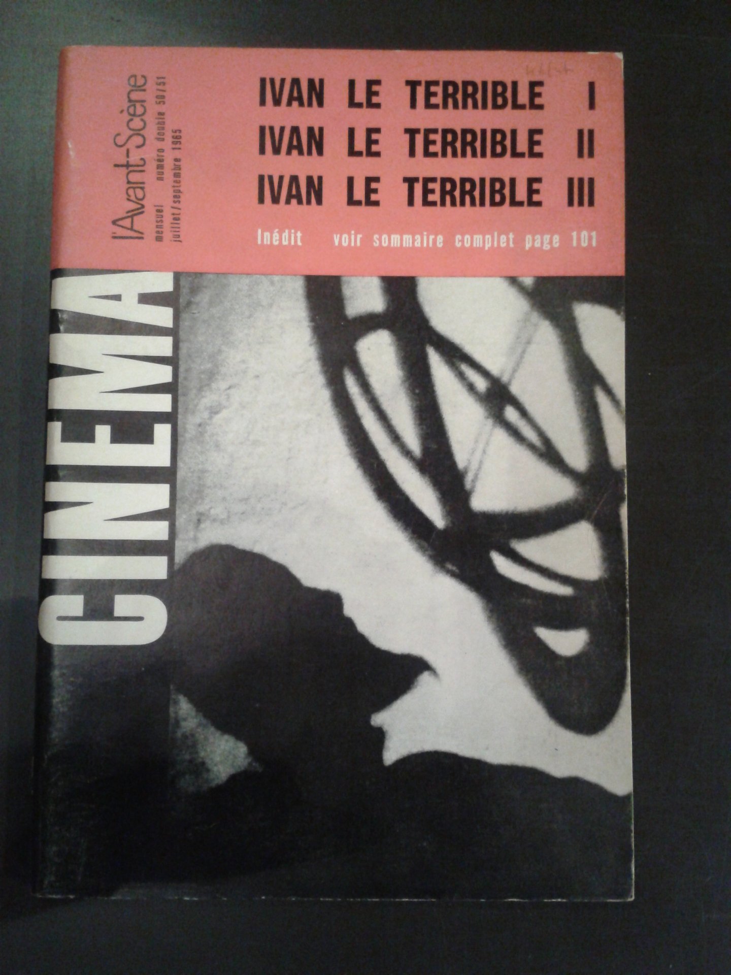 In 8°, 100 pp., ill., br., numero doppio 50/51 di luglio/settembre 1965 della rivista l'Avant-scène. All'interno sceneggiature di Ivan il Terribile, La congiura dei Boiardi e la terza parte incompiuta. Indice: Une conception historique contradictoire, Rostilav Yourenev – Deux témoignages: Mikhail Romm, Nikolai Tcherkassov – Ivan Grozny – Le complot des Boyards – Les combats d'Ivan – Dossier critique.
