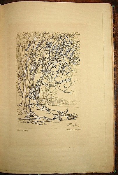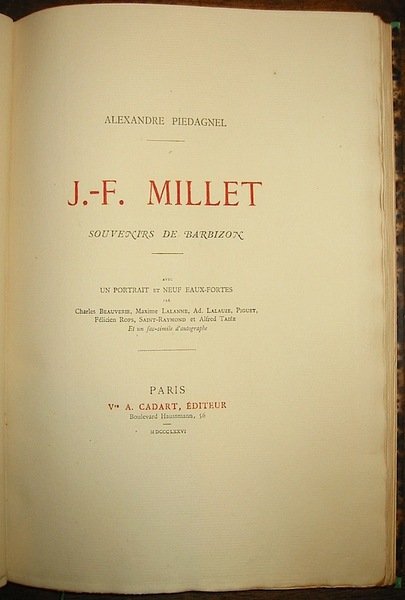 8vo (cm. 27), 108 pp., 2 cc.nn. con un ritratto di Millet e 10 acqueforti originali di Charles Beauverie, Maxime Lalanne, Ad. Lalauze, Piguet, Félicien Rops, Saint-Raymond e Alfred Taiée. Un facsimile di autografo. Bella legatura coeva in mz. marocchino bleu con nervi e titoli impressi in oro al ds. (firmata David). Taglio superiore dorato. Edizione originale in tiratura limitata e numerata di 545 copie (ns. n. 289 delle 500 in ‘papier vergé de Hollande’). Eccellente esemplare ad ampi margini.