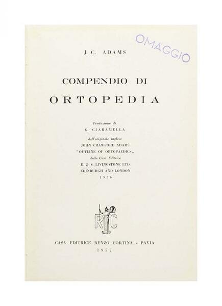 Autore: J. C. Adams Titolo: Compendio Di Ortopedia Sottotitolo: traduzione di G. Ciaramella Edizione: Casa Editrice Renzo Cortina - Pavia 1957 Dimensioni: 16 x 24 cm c.a. Pagine: 486 Copertina: Cartonato Condizioni: Buone come da foto