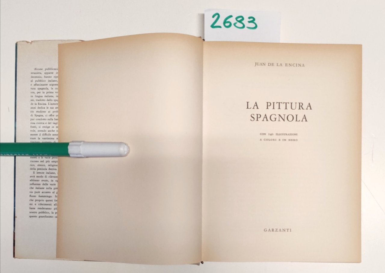 J. DE LA ENCINA LA PITTURA SPAGNOLA CON 140 ILLUSTRAZIONI A COLORI E IN NERO GARZANTI 1962 1∞ EDIZ SOVRACCOPERTA EDITORIALE CON STRAPPI AI MARGINI, COPERTINA RIGIDA IN TELA AVORIO, FREGI E CARATTERI IN ORO AL DORSO E AL PIATTO, INTERNO IN BUONE CONDIZIONI N. PAG. 217 CM. 21,5 X 16 L2683