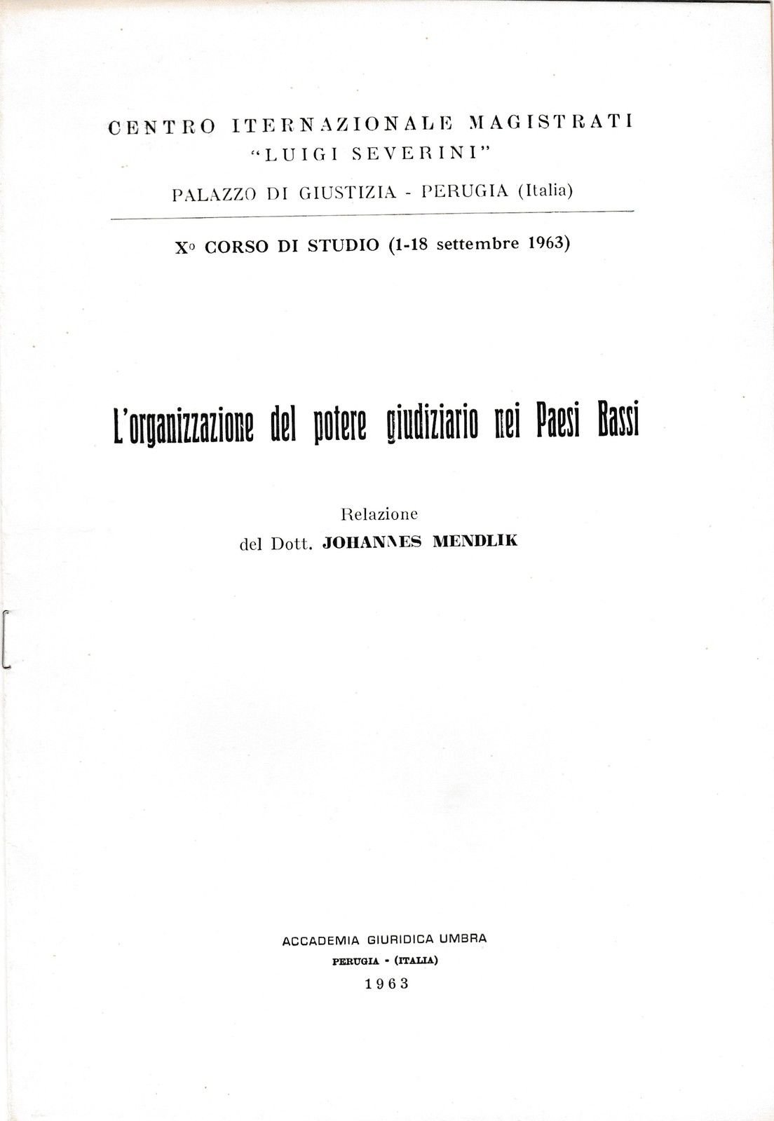 CENTRO INTERNAZIONALE MAGISTRATI LUIGI SEVERINI PALAZZO DI GIUSTIZIA -PERUGIA X∞ CORSO DI STUDIO (1-18 SETTEMBRE 1963) L'ORGANIZZAZIONE DEL POTERE GIUDIZIARIO NEI PAESI BASSI RELAZIONE DEL DOTT. JOHANNES MENDLIK PERUGIA 1963 L 4556 COPERTINA EDITORIALE MORBIDA, NATURALE LIEVE BRUNITURA AL MARGINE ESTERNO DELLE PAGINE N. PAG. 6 CM. 24 X 16,5