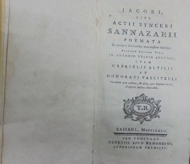 Venetiis, REMONDINI, 1782. Ex antiquis editionibus accuratissime descripta. Accessit ejusdem vita, Jo. Antonio Vulpio Auctore; item Gabrielis Altilii et Honorati Fascitelli Carmina quae exstant, & alia, quae sequens Vulpii. Praefatio melius indicabit. Contiene anche: Notizie storiche e critiche intorno alla vita e agli scritti di Scipione Capece Napolitano, estese dal Conte Giammaria Mazzucchelli Bresciano. Iniziali, testatine e finalini silografati. In 16∞: pp. XCVI + 334 Leg. in tutta pergamena coeva stanca. Lievi tracce d`uso.