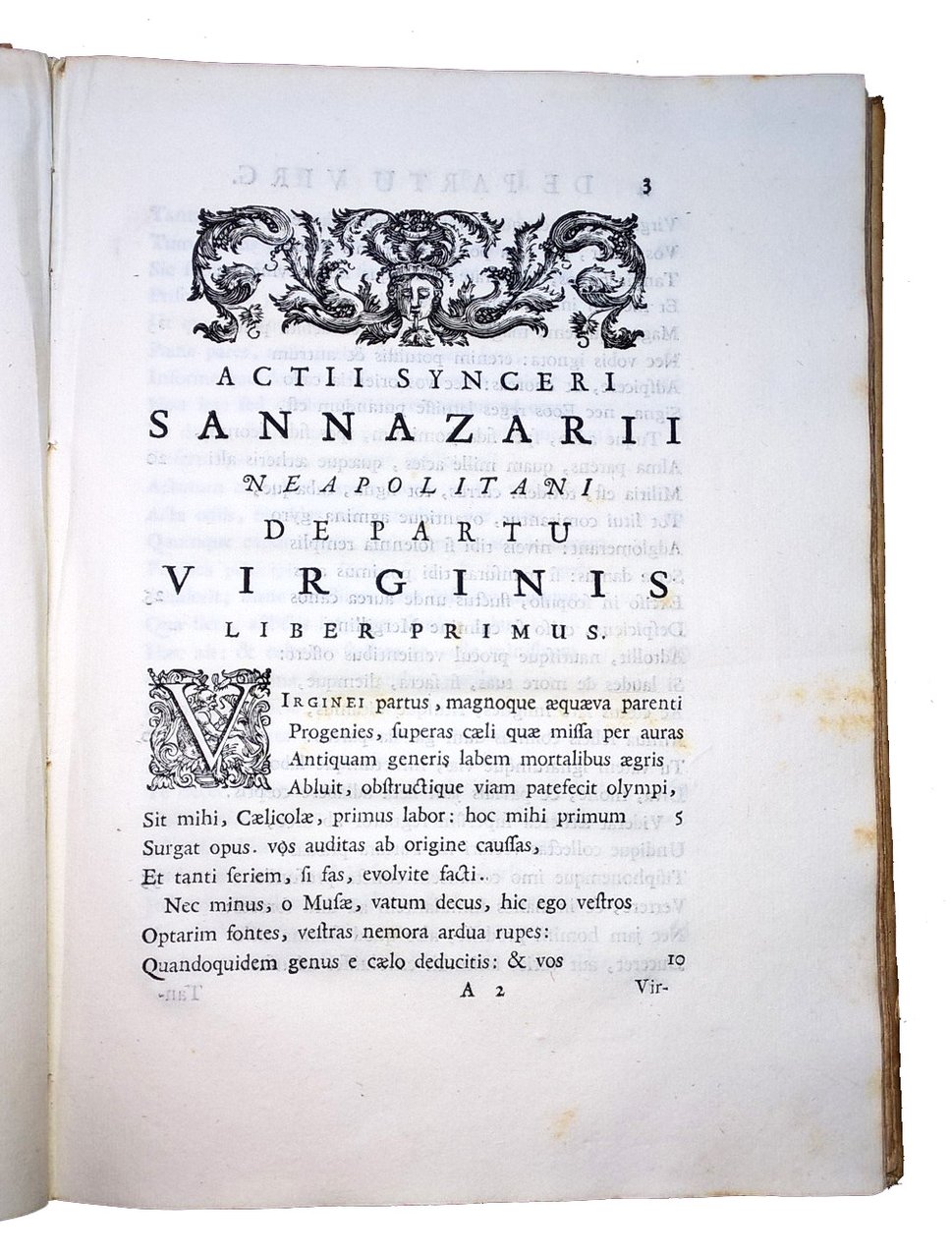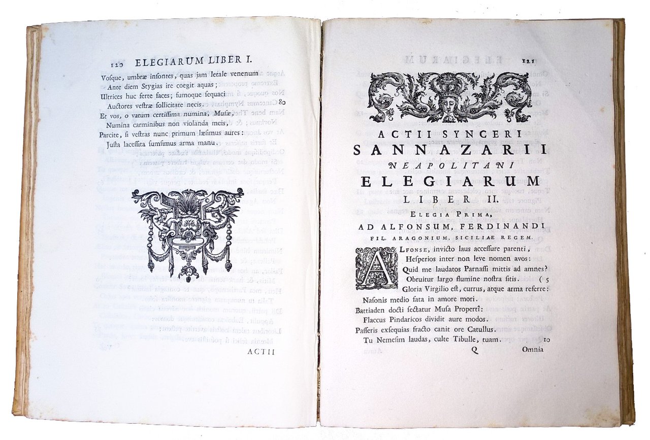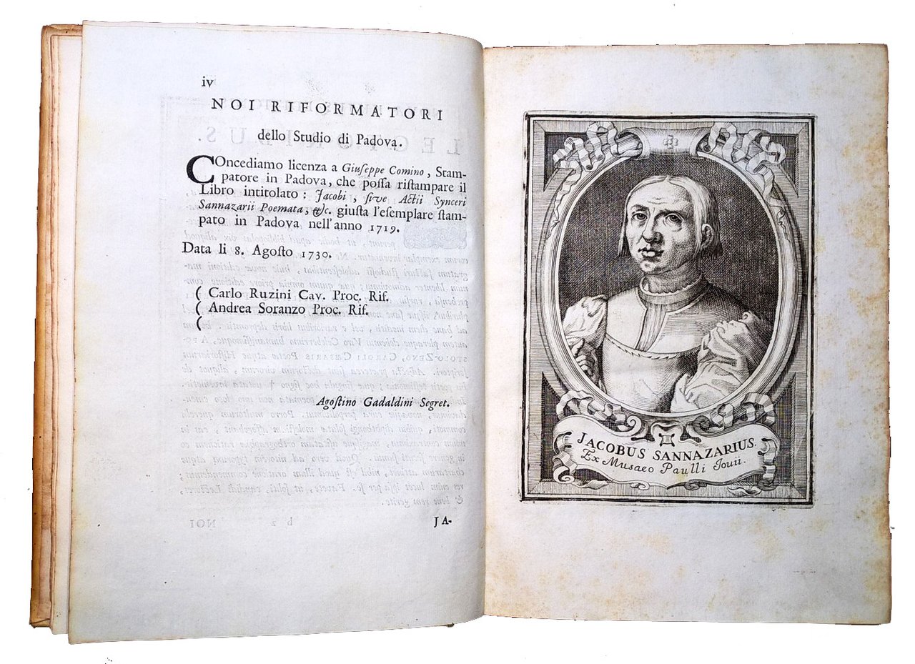 in-4° (240x178 mm), leg. coeva in piena pergamena, con titolo calligrafato al dorso e fregio disegnato sempre al dorso; pp. [8], LII, 303, [1], [1] carta di tav. (ritratto calcografico). Front. a caratteri neri con marca calcografica Cominiana; stemma xilografico del Volpi a carta 2P4v. Testatina calcografica raffigurante il medaglione con le effigi del Sannazzaro (soprannominato "Actius Syncerus"), a carta b3r; iniziali ornate e fregi xilografici. Ritratto calcografico dell'Autore (Ex musaeo Paulli Jovii). Bella edizione delle poesie di Jacopo Sannazzaro (1457-1530), poeta e umanista italiano, curata da Giannantonio Volpi, "Patron" della Stamperia Volpi-Cominiana; nell'opera sono inclusi i Carmina dei poeti Gabriele Altili e Onorato Fascitelli, amici del Sannazzaro. Ogni testo è preceduto da un proprio occhietto. Prov.: Iscrizione d'appartenenza alla prima guardia libera (L. Ceccotti). L. Ceccotti è stato un letterato e critico letterario viterbese, vissuto nella prima metà del 1800. Rif.: IT\ICCU\TO0E\027500. OCLC, 797793940. Cond.: Lievissime tracce d'uso alla legatura. Carte spesse e croccanti, con presenza di rare fioriture. Esemplare in condizioni generali decisamente molto buone. -- Beautiful Cominian edition of the poems by Jacopo Sannazzaro, in very good condition.