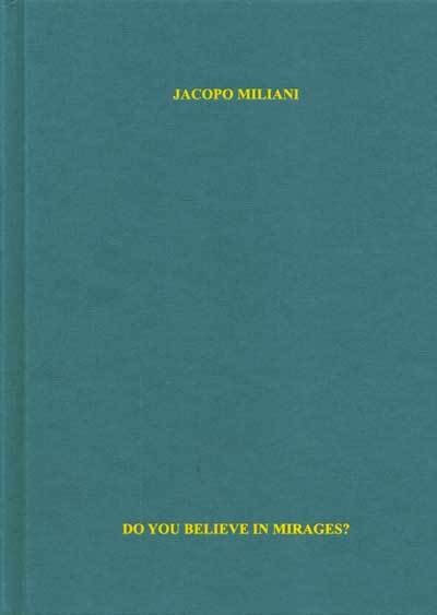 "Do you believe in mirages?" è il titolo della mostra realizzata presso EX3 di Firenze da Jacopo Miliani. Il progetto installativo e performativo prende spunto dall’idea di miraggio come immagine aperta da cui scaturiscono molteplici narrazioni. Il libro si compone di due parti: una relativa al progetto espositivo, l’altra è un percorso tra i lavori realizzati dall’artista, citazioni e immagini provenienti dalla sua ricerca e undici testi realizzati da altri artisti, curatori, performer e esperti di diversi discipline. A metà tra il catalogo e il libro d’artista e l’ipertesto virtuale, la pubblicazione presenta il lavoro di Jacopo Miliani attraverso uno sguardo composito e indiretto che rivela connessioni inedite e crea ulteriori e infinite associazioni.Testi di Rosie Cooper & Ariella Yedgar, Lucia Giardino, Timothy Hull & TM Davy, Sara Martin, Jacopo Miliani, Maurizio Nannucci, Kaya Özkaracalar & Nazli Gürlek, Francesco Pedraglio, Alessandra Sandrolini, Giuliano Scabia, Samon Takahashi e Pier Luigi Tazzi. — F.to: 16,5x23,5; pagg. 192; COL e BN; rileg. rigida. Editore: A&Mbookstore Edizioni, Milano, 2012.