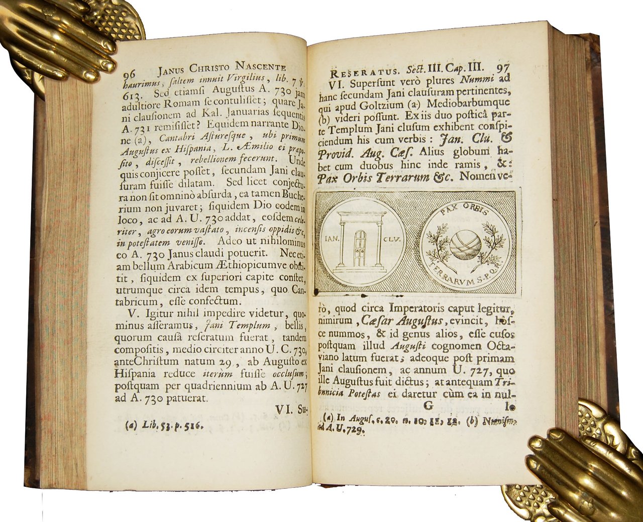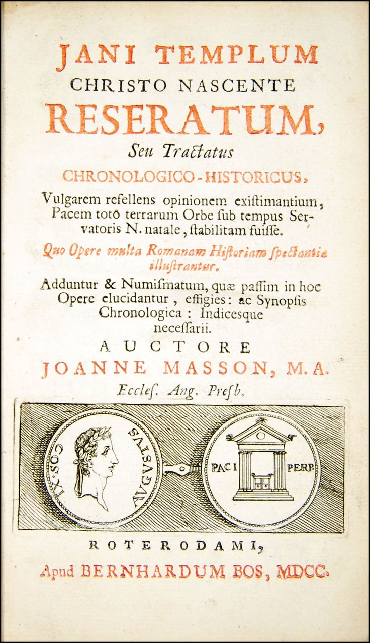 Jani Templum Christo nascente reseratum, seu Tractatus chronologico-historicus, vulgarem resellens opinionem existimantium, pacem toto terrarum orbe sub tempus servatoris N. natale, stabilitam fuisse. Quae opere multa romanam historiam spectantia illustrantur, adduntur et numismatum, quae passim in hoc opere elucidantur, effigies: ac synopsis chronologica: indicesque necessarii […].
