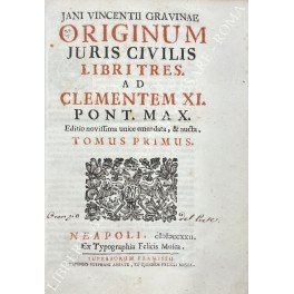 Frontespizio a caratteri neri e rossi marca tipografica testatine finalini capilettera ornati. L'Autore fu il primo dei giureconsulti italiani a porre in dubbio la validità delle tesi assolutistiche. Ancora prima del Montesquieu nel suo trattato mostra il proprio pensiero sul problema del diritto pubblico con una sottilissima analisi dell'evoluzione storica dell'ordinamento giuridico romano e con una profonda disquisizione sulle questioni relative alla sovranità. Con Gravina si comincia a vagheggiare l'ideale di un diritto di ragione e si vedono affermati quelli che saranno i postulati del nuovo diritto pubblico, la divisione dei poteri, il limite all'autorità statale e la tesi della inalienabilità della sovranità popolare che appartiene ai cittadini e che non può essere mai concessa al detentore del potere politico se non per un esercizio temporaneo e vincolato ad usarla per il bene di tutti. E' questo l'inizio dell'Illuminismo giuridico