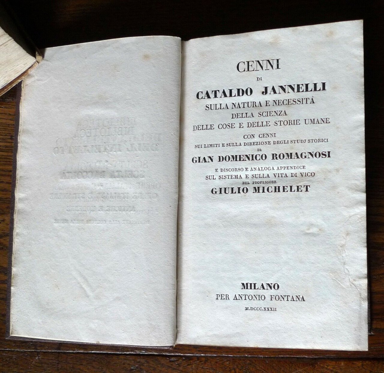 - CENNI DI CATALDO JANNELLISULLA NATURA E NECESSITÀ DELLA SCIENZADELLE COSE E DELLE STORIE UMANE- CON CENNI SUI LIMITI E SULLA DIREZIONEDEGLI STUDI STORICI DI GIAN DOMENCIO ROMAGNOSI- E DISCORSO E ANALOGO APPENDICESUL SISTEMA E SULLA VITA DI VICODEL PROFESSORE GIULIO MICHELET.Milano, per Antonio Fontana, 1832,copertina rigida rifatta, rilegatura in tela,18x11,5 cm., pp.XCIV-228,BIBLIOTECA DELL'INTELLETTO O SIASCELTA RACCOLTA DI OPERE ITALIANE E STRANIEREANTICHE E MODERNE DESTINATE ALLA
