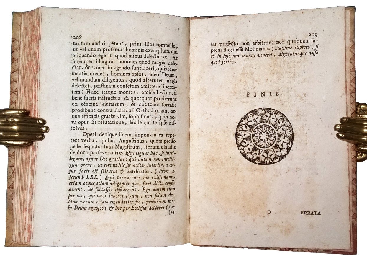 in-8°, 188x130 mm, leg. coeva in mezza pergamena e carta decorata a mano ai piatti, titolo e fregi dorati al dorso, tagli marmorizzati di rosso; pp. 209, [3]. Primo capolettera e finale del'opera xilografati. Il nome dell'A. si ricava da: Melzi, Diz. op. anon., vol. 2, p. 12. E' anche scritto a mano al frontespizio: "per R.P.M. Pignon e Carrecto e consiliis P. Magistri Gen. Ord. Erem. S. Aug.i". Rara edizione originale di quest'opera polemica antitomistica, che espone le sentenze di s. Agostino sulla grazia necessaria alla creatura innocente, con il fine pratico di formare i novizi dell’Ordine alla corretta teologia agostiniana. In pratica, l’Autore intendeva dimostrare l’incompatibilità della predeterminazione fisica con la dottrina agostiniana sulla Grazia, collocandosi contro il determinismo in natura, a sostegno di una visione provvidenzialistica della storia. L'Autore, Pignone del Carretto, Giorgio (in religione Emmanuele Maria)(1721-1796), nato da una famiglia nobile, divenne sacerdote agostiniano, lettore di filosofia e teologia e reggente dello Studio teologico di Napoli; insegnò anche negli Studi di altre province agostiniane d’Italia; infine fu nominato vescovo per la diocesi di Sessa Aurunca; scrisse questo libro per difendere l’ortodossia del vescovo spagnolo Juan de Palafox y Mendoza contro le accuse dei teologi gesuiti durante la causa di beatificazione. Palafox y Mendoza, Juan (1600-1659), vescovo cattolico, ricoprì anche incarichi politici nel Nuovo Mondo; fu viceré della Nuova Spagna, dove lottò contro la corruzione del suo tempo; è stato beatificato il 5 giugno 2011. Rif.: IT\ICCU\RLZE\008178. OCLC, 2922339. Cond.: Tracce d'uso alla legatura (forellini di tarlo al dorso, leggere abrasioni alla carte dei piatti). Carte croccanti ma con presenza di alcune fioriture e occasionali bruniture. Opera nel complesso molto buona.