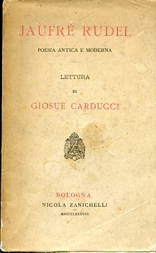 In-16°, pp. 66, brossura editoriale a stampa rossa e nera. Marche tipografiche ai piatti, qualche elegante fregio n.t. Fioriture, ma ottima copia serbata entro velina. Prima edizione. Lettura carducciana 'tenuta in Roma alla Palombella il dì VIII Aprile MDCCCLXXXVIII' e avente come oggetto il grande trovatore provenzale, di cui il Carducci immortalerà l'amore con la contessa di Tripoli Melisenda nella lirica 'Jaufré Rudel', poi compresa nelle 'Rime e Ritmi'. La suddetta lirica figura qui alle pp. 53-58 ed è seguita da una 'Bibliografia di Jaufré Rudel'. Salveraglio, 167. Parenti, Prime edizioni, p. 129. Parenti, Rarità, V, p. 300.