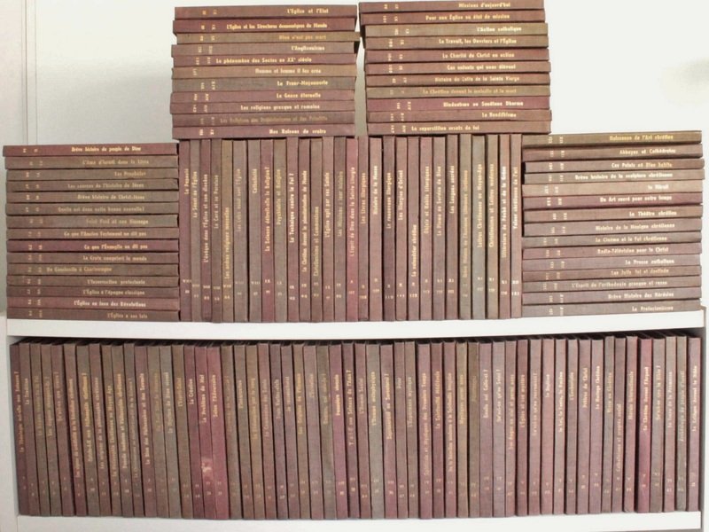 Au total, 142 vol. in-12 carrés reliure pleine toile éditeur, Librairie Arthème Fayard, Paris, 1965-1965, 124 pp. par volume. Encyclopédie divisée en 14 parties d'une dizaine de volumes chacune. Partie I : Je sais - je crois ; II : Les grandes vérités du salut ; III : Qu'est-ce que l'homme ; IV : La vie en Dieu, les médiateurs ; V : Présence du salut parmi nous ; VI : La Bible, livre de Dieu, livre des hommes ; VII : L'Eglise dans son histoire; VIII : L'Eglise dans son organisation ; IX : Les problèmes du Monde et de l'Eglise ; X : L'Eglise dans sa liturgie et dans ses rites ; XI : Les lettres chrétiennes ; XII : Les arts chrétiens ; XIII ; Frères séparés ; XIV : Religions non chrétiennes et quêtes de Dieu Manquent seulement 8 volumes sur les 150 de l'Encyclopédie (vol. 1, 7, 8, 22 , 75 , 85 , 125 et 150), Ensemble rarament aussi complet., Etat très satisfaisant. Il s'agit ici d'un rare, remarquable et impressionnant ensemble, rédigé par les meilleurs spécialistes (Régis Jolivet, Charles Journet, Raymond Vancourt, Etienne de Greef, Yvan Gobry, Jean Daujat, François Amiot, Bernard De Vaulx, Etienne Drioton, M. J. Le Guillou, Claude Tresmontant, Maurice Nédoncelle, Louis Gardet, joseph Lécuyer, Cornelis et Léonard, Y.-M. Congar, Jean Steinmann, Louis Cognet, Pie Régamey, Jean-marie Aubert, etc.). Poids de 28 Kg.