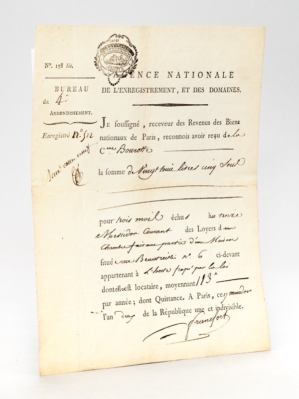 "Je soussignée, receveur des Revenus des Biens Nationaux de Paris, reconnois avoir reçu de la Citoyenne Bourotte la somme de vingt-huit livres cinq sols pour trois mois échus au treize Messidor courant des Loyers d'une Chambre faisant partie d'une Maison située rue Beautreillis n°6 ci-devant appartenant à l'Hoste frappé par la loi dont elle est locataire, moyennant 113 Livres par année ; dont Quittance, ce 17 messidor l'an deux de la République Une et Indivisible"