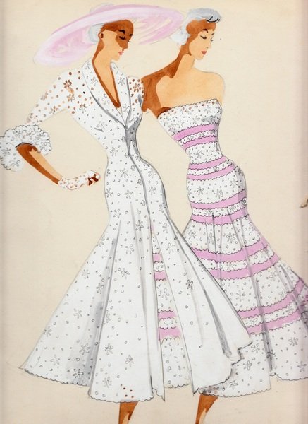Jean Desses. (1904 - 1970). Disegnatore di moda tra i più importanti e famosi al Mondo nel 1940, 1950 e 1960. Disegno originale attribuibile a Desses colorato a mano per un bozzetto di un'abito.