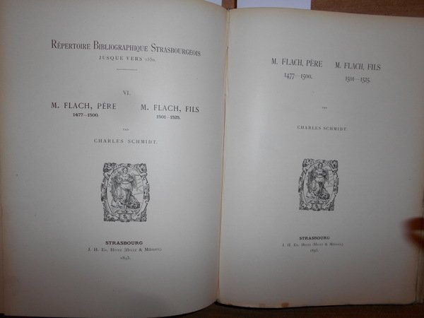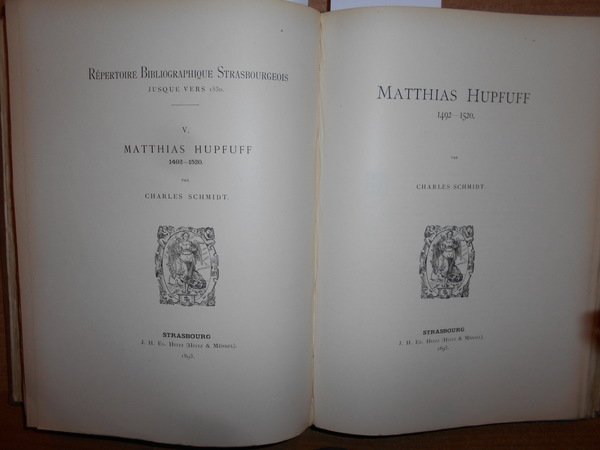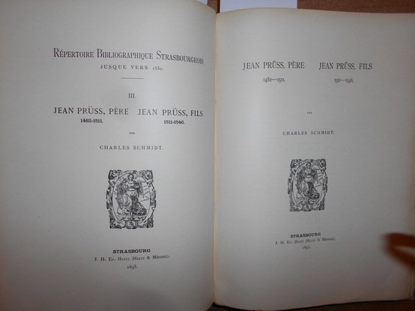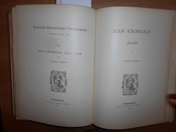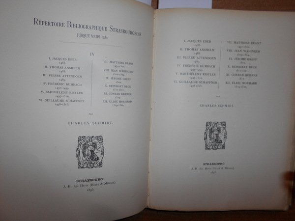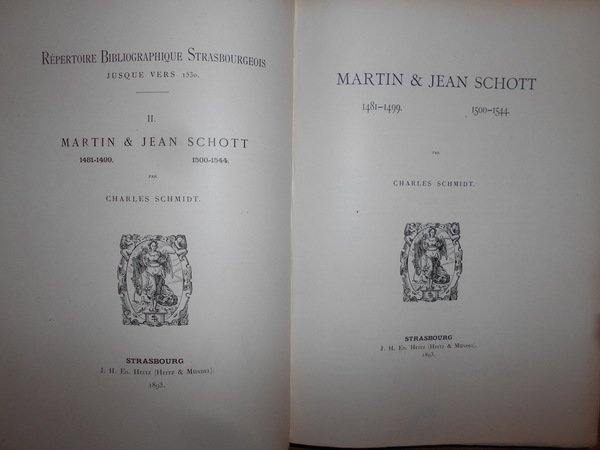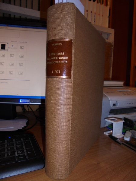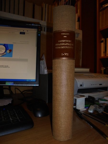 Charles, Schmidt. Strasbourg, J.H. Ed. Heitz & Mundel, 1893. Jean, Grüninger. Répertoire bibliographique strasbourgeois. VII parti in un volume, tela con titolo ìn oro entro tassello al dorso, taglio superiore dorato, in barbe. 1483-1531 viii, 107 pp. con 4tavole f.t.; 1481-1499 1500-1544 ix, 68 pp. con 4tavole f.t.; 1482-1511 1511-1546 vi, 46 pp. con 4 tavole f.t.; viii, 35 pp. con 4 tavole f.t.; 1492-1520 46 pp. con 4 tavole f.t.; 1477-1500 1501-1525 viii, 41 pp. con 4 tavole f.t.; 1500-1528 ix, 102 pp. con 4 tavole f.t. Supplement au tome II - Martin & Jean Schott 1481-1499 1500- 1548 vii, 21, (1) pp. Bell' esemplare in legatura recente con barbe. Uff. E - I - 6