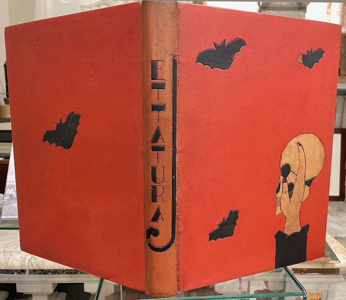 (Jettatura-Napoli-Figurato-Legatura) GAUTHIER Theophile. Jettatura. Compositions et gravures en couleurs de François Courboin. Paris, A. Romagnol (Collection des Dix), 1904. In-folio picc. (cm 36x26); frontespizio bicolore, pp. (4)-193-(2) con 25 illustraz. a colori n.t. disegnate dal bravo François Courboin (che alfine di riprodurre con esattezza e fedeltà i luoghi descritti, non esitò a soggiornare per un mese a Napoli) e finemente incise allacquaforte da A. Porcabeuf di Parigi, che si ripetono in bianco e nero su tavv. f.t. Magnifica legatura Dèco, in pieno marocchino color carota, firmata da Max Fonseque, ai piatti intarsi policromi in pelle con figurazioni allusive al famoso romanzo di Theophile Gautier di ambientazione napoletana, con figure scaramantiche di pipistrelli e di un teschio sorretto da una mano, al dorso, titolo stilizzato impresso in nero. Taglio dorato, conserv. la bella custodia, coeva alla legatura certamente realizzata dallo stesso Fonseque. Sguardie in marocchino nero e controsguardie in raso rosso. Conserv. il dorsetto e la cop. originale, con vignetta raffig. una mano intenta a fare il gesto scaramantico delle corna.