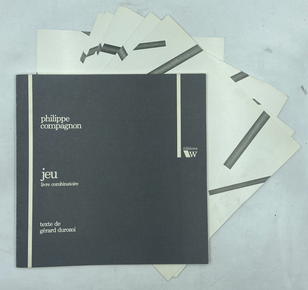 Brossura editoriale cm 25 x 25, pp 57 (3) illustrate in nero, 12 tavole-carte del gioco combinatorio stampate in nero su cartoncini cm 25 x 25. Lavoro a quattro mani del pittore Philippe Compagnon e del filosofo e storico del surrealismo Gérard Durozoï, con riflessione di quest’ultimo su come la pittura del primo dalla narrazione figurativa si sia evoluta in una «combinatoire diabolique» attraverso l’amore per le biciclette.