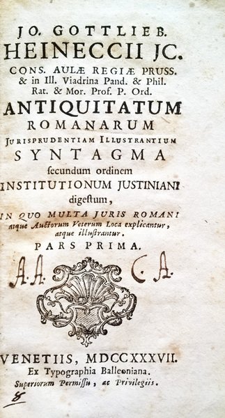Jo. Gottlieb. Heineccii . Antiquitatum Romanarum jurisprudentiam illustrantium syntagma secundum ordinem institutionum Justiniani digestum, in quo multa juris Romani atque auctorum veterum loca explicantur, atque illustrantur. Pars prima [-secunda]