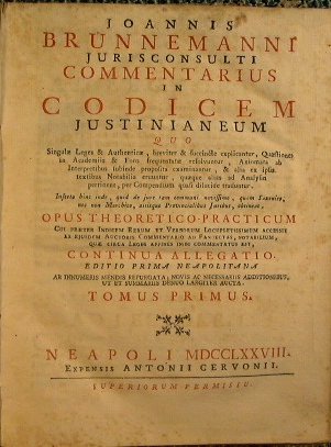 Joannis Brunnemanni Jurisconsulti Commentarius in Codicem Justinianeum.Opus theoretico-practicum.continua allegatio editio prima neapolitana