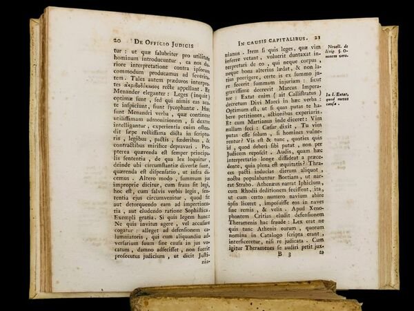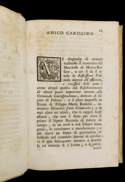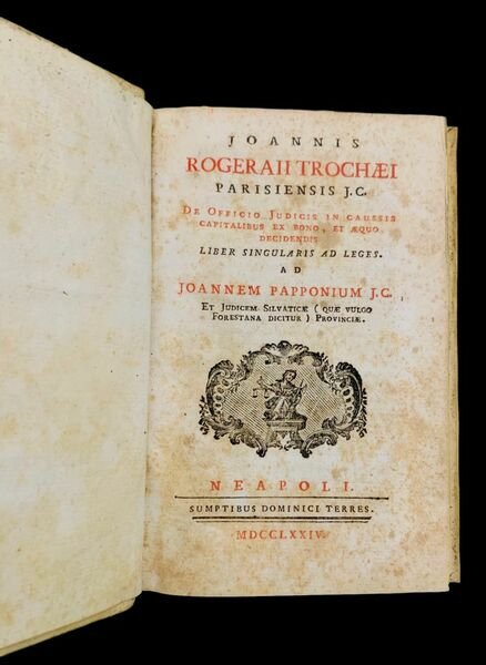 In 8° (18,5x11,5 cm); XLVIII, 196, (2) pp. Legatura coeva in piena pergamena con titolo impresso in oro al dorso. Tagli spruzzati in rosso. Qualche leggera brunitura, ininfluente, come tipico della carta napoletana. Rara riedizione settecentesca del noto trattato del noto giureconsulto ed umanista parigino, Joannes Trochaeus Rogeraius edito per la prima volta a Lione nel 1550. L'opera è dedicata al giureconsulto francese, Jean Papon, 15071590 che fu tenente generale di Forez dal 1545 al 1585. L'opera, dal forte afflato umanista, contiene un commento critico al Marcianus libro secundo de publicis iudicis" ed il "Claudius Saturninus libro singulari de poenis paganorum" testi di diritto romano fortemente legati l'uno all'altro ed inerenti al diritto penale criminale. Il testo vero e proprio del cinquecento, è in questa edizione del 1774, preceduto da un lungo com mento, anonimo, che prende spunto dal dibattito suscitato dalla pubblicazione dei De' delitti e delle pene nel 1764. Si legge all'inizio della lunga introduzione, di trenta pagine, anonima, intitolata Lettera di un anonimo scritta ad un amico personaggio ragguardevole, Su di alcuni punti interessanti della Giurisprudenza Crimimale: Amico Carissimo, Vi ringrazio di avermi trasmesso il trattatino del Marchese di Monte-Rosato, a cui si dà il titolo di Riflessioni Politiche intorno all'efficacia e necessità delle pene: come altresì quello del Rischiaramento di alcuni punti importanti intorno alla Criminale Giurisprudenza, dedicato al Signor di Voltaire; e l'altro impresso in Roma di Filippo Maria Renanzi, intitolato Elementa Juris Criminalis; e se mai altro ne uscirà, che si raggiri sugli assunti, che non è stato per altro il prim o il Signor Beccaria di ponere in campo, io ne avrò a voi sempre buon grado, se continuate a mandarmene; e per darvi un segno di gratitudine vi soddisfo nel comando datomi di palesarvi il mio sentimento intorno a quanto fu tal materia si è scritto, e si continu erà forse a scrivere nella nostra Italia non meno, che ne' Paesi oltramontani ancor sul torno del discorso pronunciato nel Parlamento di Grenoble dal Signor Servand, che da voi ancor l'ho ricevuto. Sin da quando mi capitò il trattatino del suddetto Signor Becaria De' delitti e delle pene, vi dissi, che vedea nell'opera dell'Autore il fondo del suo animo portato per tutta all'umanità: che le massime dette ancor prima, e dopo di lui da altri, alle quali ha data una sopravveste enfatica di novità, si veggono scritte, supponendosi gli uomini tutti uniformi, cioè spogliati della passion dominante dell'amor proprio, e portati tutti egualmente all'amore della Società: che meritava compatimento il Signor Beccaria, per aver scritto senza veder da vicino, come si vede col lungo esercizio del Ministero Criminale, tutte le razze degli uomini, e quali sieno nel pratico de' pensamenti loro, e delle loro azioni. Rara edizione e prima ed unica edizione con il lungo commento sulla Pena di morte. Esemplare in buone-ottime condizioni di conservazione. Rif. Bibl.: IT\ICCU\NAPE\010556.