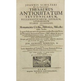 Joannis Schilteri . Thesaurus Antiquitatum Teutonicarum ecclesiasticarum civilium letterariarum. UNITO A Ad secundum tomum Thesauri Antiquitatum Teutonicarum Schilteriani parapolimena. Pp. (4) +4 Tomus secundus exhibens Monumenta Civilia Historica Miscella edita inedita. Legem Salicam novo & gemino conspectu cum notis. Jus Provinciale Alemannicum . Joh. Georgius Scherzius Pandectarum & Juris Publ. . Operi undique provisum ut accurata prodiret. Praefationem praemisit Joannes Frickius. Pp. VIII. UNITO A Antiquissimae Legis Salicae Textus Vetustior ex Bibliotheca Parisiensi . Pp. XIV + 94 UNITO A Jus Provinciale Alemannicum alias sub nomine Speculi Suevici comprehensum Ex insigni Codice MSC. Membranaceo . Pp. XVIII + 240. UNITO A Strickeri
