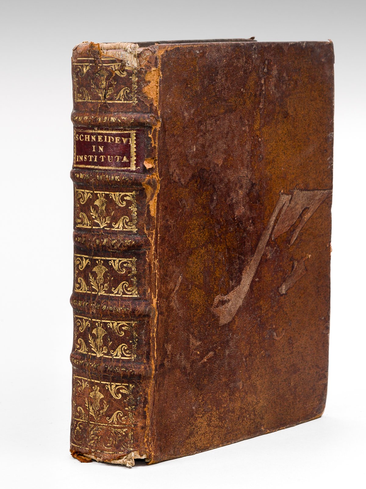 In hac Nova Editione, prae caereris nobilissima & accuratissima [. ] additus est index materiarum scitu dignarum, vetere illo ex Annotationibus Gothofredi & aliorum longè locupletior, 1 vol. in-4 reliure de l'époque pleine basane marron, dos à 5 nerfs, Viduae Wilh. Metternich & Filii [Veuve Metternich et Fils ], Coloniae Agrippinae [ Cologne - Köln ], 1740 Fils adoptif et élève de Martin Luther, Johann Schneiderwein (1519-1568) connut un grand succès avec ce commentaire sur les Institutes, qui sera souvent réédité deux siècles durant. Adopted son and student of Martin Luther, Johann Schneiderwein (1519-1568) enjoyed great success with this commentary on the Institutes, which was often republished for two centuries. Etat très satisfaisant (mq. en coiffes, reliure frottée avec mq. en coupes, mq. à la première garde volante, mq. la seconde garde volante, bon état par ailleurs)