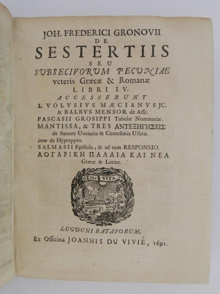 Joh. Frederici Gronovii De sestertiis seu subsecivorum pecuniae veteris Graece & Romanae libri IV. Accesserunt L. Volusius Maecianus Jc. & Balbus Mensor de asse. Pascasii Grosippi Tabulae nummariae. Mantissa, & tres antex?g?seis de foenore unciario & centesimis usuris. Item de hyperpyro. Salmasii epistola, & ad eam responsio. Logarik? palaia kai nea Graece & Latine
