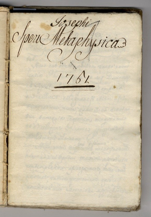 [Siena?], [s.n.], 1761, manoscritto su carta, in-4 piccolo, cartonatura rustica coeva, carte [120]. Steso da due mani, in chiara grafia. Giuseppe Speri fu Curato di S. Quirico e insegnò filosofia e metafisica a S. Giorgio, il Seminario Arcivescovile di Siena. Manca la metà di una carta, con perdita del relativo testo,altrimenti ottime condizioni.