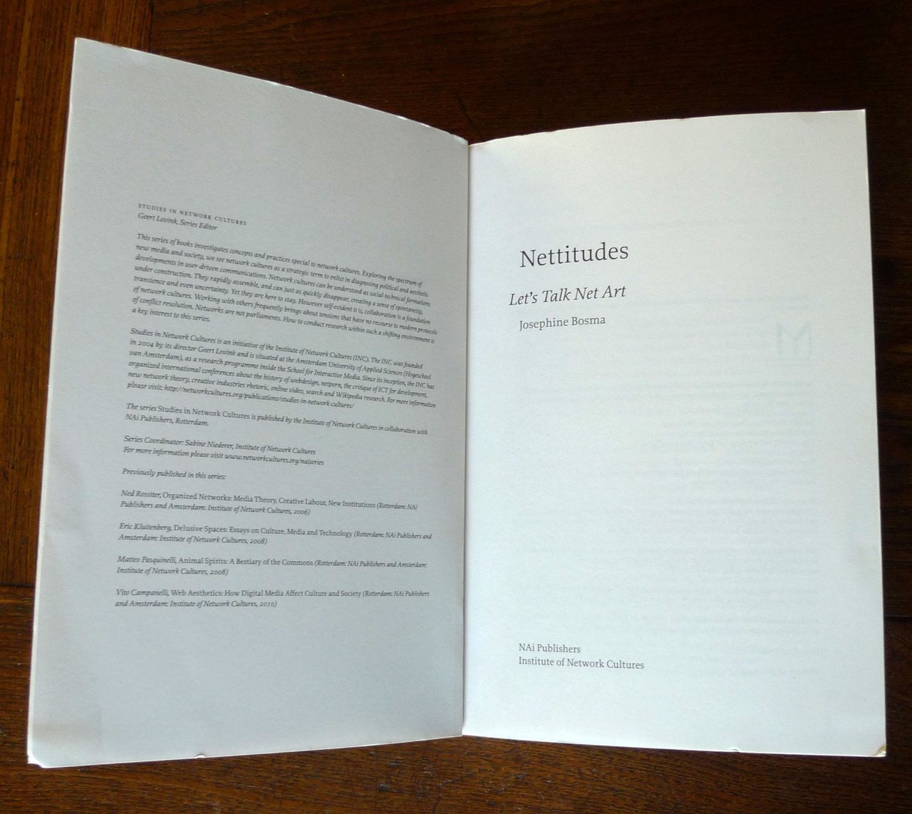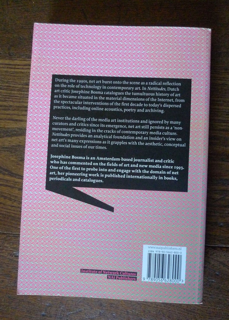 Josephine Bosma,NETTITUDES.LET'S TALK NET ART.NAi Publishers / Institute of Network Cultures,Rotterdam 2011,brossura, 21x14 cm., pp.270,STUDIES IN NETWORK CULTURES,testo in inglese,ISBN: 978-90-5662-800-0,peso: g.500cod.6412CONDIZIONI DEL LIBRO: ottimedalle note editoriali:Never the darling of the media art institutions and ignored by many curators and critics since its emergence, net art still persists as a ‘non-movement’, residing in the cracks of contemporary media culture. The book 'Nettitudes. Let's Talk Net Art' provides an analytical foundation and an insider’s view on net art’s many expressions as it grapples with the aesthetic, conceptual and social issues of our times.Net art is art based on Internet cultures, which revolve around technology, games, social networks, commerce and politics. Net art is still fairly unfamiliar to the general public in the Netherlands, which is odd, given that Dutch net artists have ranked among the world leaders since the mid 1990s. In Nettitudes that prominent Dutch role in net art is clearly evident in the midst of the international examples. Works of net art are almost always interdisciplinary.Whether stage director, filmmaker, sculptor, musician, painter, photographer, writer, poet or dancer, creating net art allows the creator to escape from the corner in which traditional art criticism has held them hostage for decades. A well-known exponent of this artistic trend is Jodi (the Dutch-Belgian artist duo Joan Heemskerk and Dirk Paesmans). The artist Peter Luining and the Internet personality Mouchette.org also enjoy international renown.