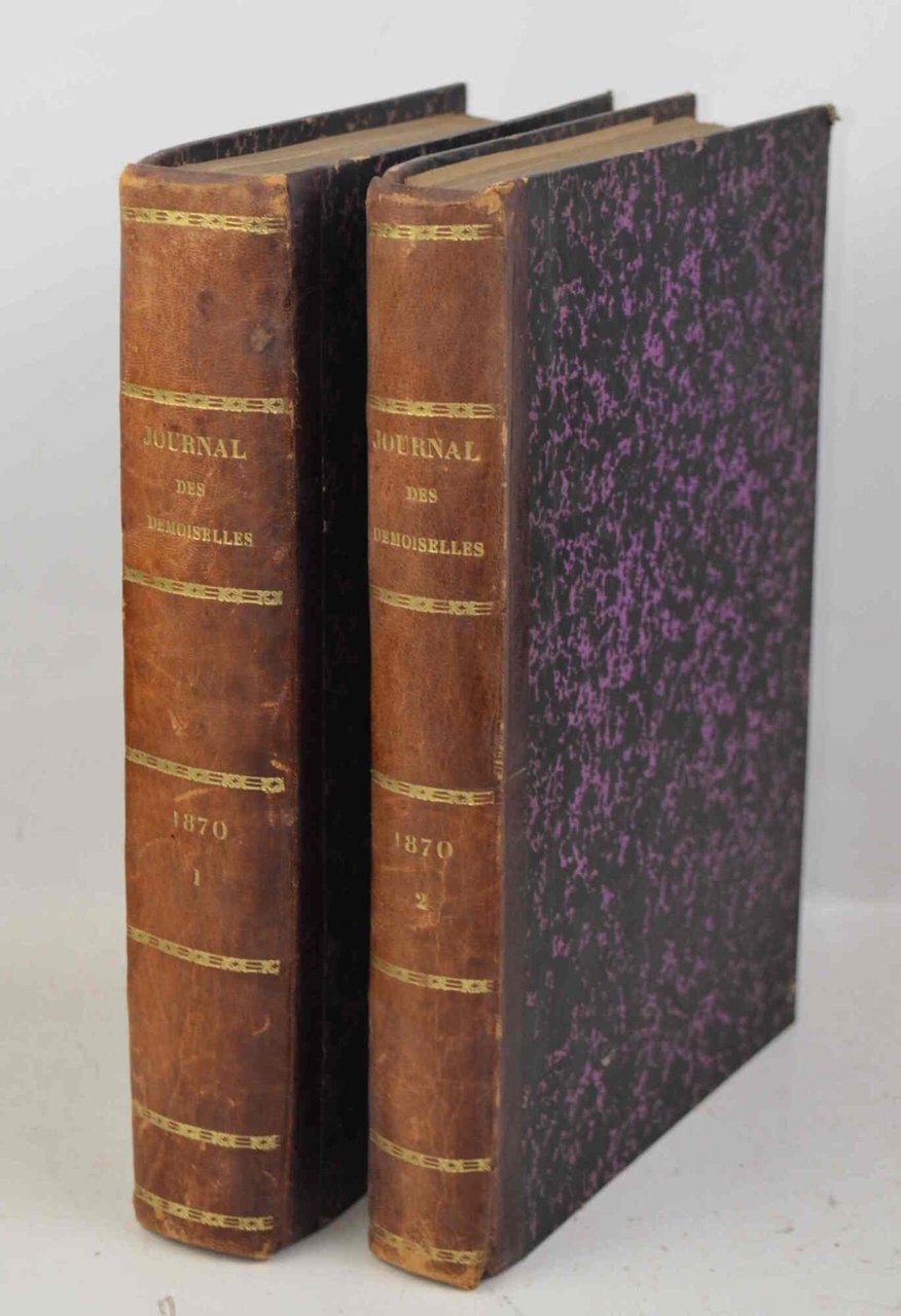 Due volumi di cm. 27, pp. 380 complessive + molti fascicoli aggiunti. Con molte tavole f.t. perlopiù a colori e molte grandi tavole più volte ripiegate e stampate su carta gialla con esempi di modelli di vestiti Solida legatura coeva in mezza pelle, dorsi lisci con titoli in oro. Esemplare genuino e ben conservato.