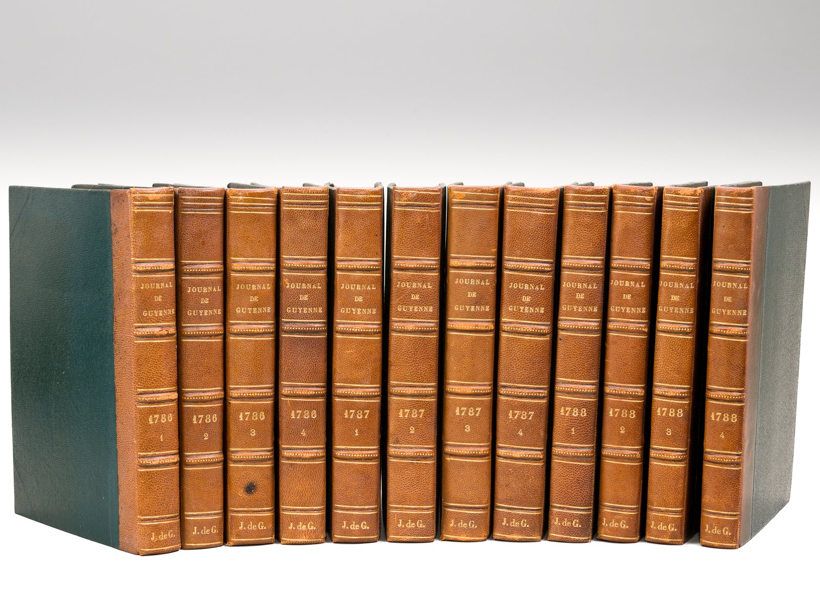 12 vol. in-4 reliure postérieure demi-chagrin brun, dos à 4 nerfs dorés, initiales J. de G. au dos en queue (probablement l'écrivain bordelais Jules de Gères, 1817-1878), De l'imprimerie de P. G. Calamy, Bordeaux, 1786-1788, 1460 ; 1460 ; 1466 pp. (manquent pour l'année 1788 les 8 numéros suivants : 39, 45, 46, 47, 110, 132, 161, 162 et 307) Très remarquable ensemble réunissant la quasi intégralité des numéros du "Journal de Guienne" parus du 1er janvier 1786 au 31 décembre 1788. Il s'agit de l'une des toutes premières publications quotidiennes de la presse de Province ("peut-être la première" ose avec prudence Labadie). Le journaliste Henri-Elisabeth Gaufreteau, l'auteur dramatique Clozanges (mort en 1785) et l'abbé Dupont des Jumeaux (précepteur des enfants de l'intendant Dupré de Saint-Maur) avaient obtenu le privilège de publier le "Journal de Guienne", aux dépens des "Annonces, Affiches et Avis divers" des frères Labottière. Le prospectus publié le 1er septembre 1784 précisait les buts : "Encourager le commerce et répandre les lumières parmi ceux qui l'exercent, tel doit être dans nos provinces maritimes le but des ouvrages périodiques"). Sur le frontispice de chaque numéro, on peut lire la dédicace au Maréchal de Mouchy, Mgr. Philippe de Noailles (bien qu'il eût cessé d'être lieutenant général de la province en 1785). Après un rappel de faits historiques en date anniversaire, on trouve dans chaque numéro l'indication des heures de marée à Bordeaux, les relevés météorologiques (d'avant-hier !) et surtout le détail de la construction, de l'armement, de la cargaison, de la destination et des heures de départ et d'arrivée des navires. Suivent le prix de diverses denrées (vin, pain, eaux-de-vie.) et une intéressante rubrique "d'avis divers" (petites annonces d'emplois, d'offices à vendre, de biens à louer ou vendre.), mais aussi "d'effets perdus et trouvés" ("on a perdu, dans le parterre de la Comédie, une Montre d'Or, à répétition, guillochée, ayant les bords formés de différens ors, en ruban, & portant le nom de J. Leroi, à Paris ; elle étoit attachée à une chaîne à trois branches, à perles & à deux médaillons, avec deux bagues, sur une cassolette & clef de même métal [. ]" ou dans le numéro du 19 janvier 1786 : "Vendredi, 13 du courant, il s'est envolé de l'Archevêché un gros Perroquet hara. Récompense à qui le rapportera au Suisse dudit hôtel"). A la suite, on lit des comptes-rendus d'ouvrages de sciences et de littérature (ainsi, le 18 février 1786, une longue recension de la suite et fin des Opinions de Tristram Shandy de Sterne), le détail des spectacles (le 10 janvier 1786 : "Petits Comédiens privilégiés de Mgr le Duc d'Orléans &c aujourd. à 10 h. du soir, Grand Bal, paré & masqué. Prix : 30 s. par personne" ou "Automate escamoteur hollandais, dans la loge de bois, sur les fossés de l'Hôtel-de-Ville, aujourdh. à 4 h. & 7 h. du soir. Farces, Scènes Pyriques, Métamorphoses & Tours d'Escamoteur &c. Prix des Places 24 s., 12 s. & 6 s.). Dans ce journal, le mathématicien Paul Larroque, né à Tonneins, rédigeait les articles intitulés "Epoques historiques". Bon exemplaire (petit trou de ficelle à chaque numéro, qq. livraisons plus usagées mais très bon état général) pour cet ensemble remarquable, de toute rareté en mains privées, réunissant près de 3 années sur les 6 années d'existence du journal (créé en 1784 et interrompu en 1790). Une mine d'information exceptionnelle sur la vie quotidienne à Bordeaux à la fin de l'Ancien Régime. Desgraves, La Presse à Bordeaux, 99-100 ; Labadie, La Presse Bordelais pendant la Révolution, 25-37