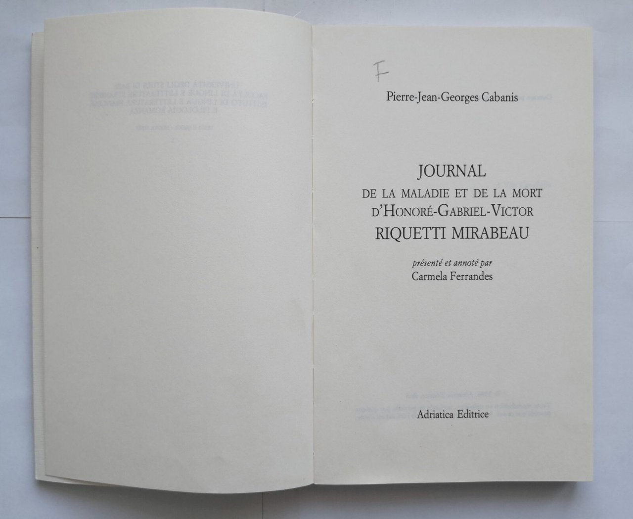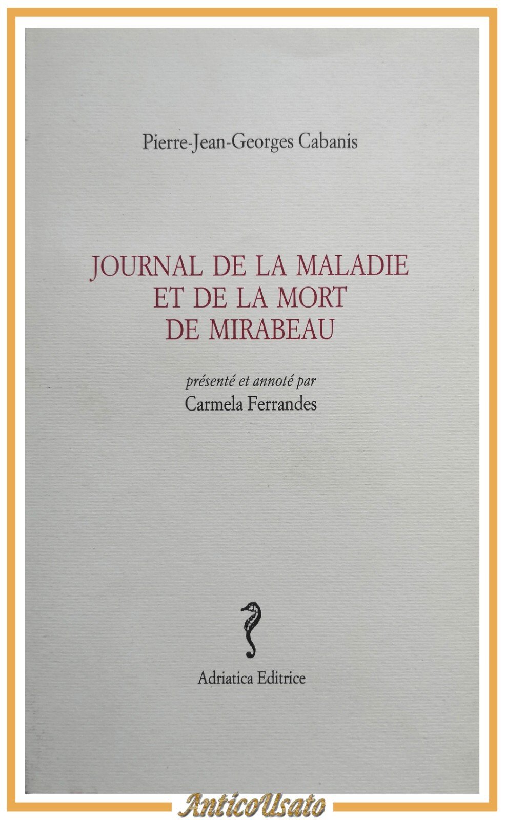 JOURNAL DE LA MALADIE ET DE LA MORT DE MIRABEAU di Cabanis 1996 Adriatica Libro