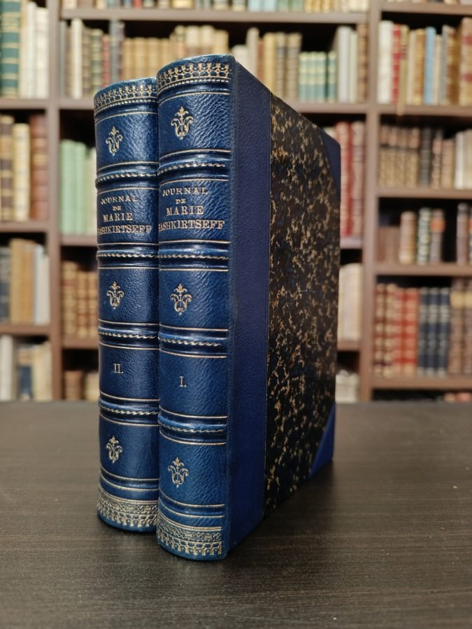 2 volumi in-16° (cm. 17,2), legature d'amatore in mezza pelle blu ad angoli, dorsi a nervi con titoli, filetti e fregi in oro ai comparti, tagli e risguardi marmorizzati; pp. [4] 401 [3b], [4] 591 [1b] in ottimo stato (solo una lievissima brunitura uniforme); con 1 ritratto fotografico in nero all'antiporta fuori testo. Pubblicazione postuma del diario autobiografico di Marie Bashkirtseff, pittrice, scultrice e scrittrice russa, che visse e lavorò in Francia. Bella testimonianza della storia spirituale della giovane artista e della sua famiglia, ma anche dell'ambiente nel quale crebbe; l'opera si caratterizza per i brillanti ritratti dei suoi contemporanei. Ottimo esemplare conservato in custodia marmorizzata con interno in velluto. (NB3)