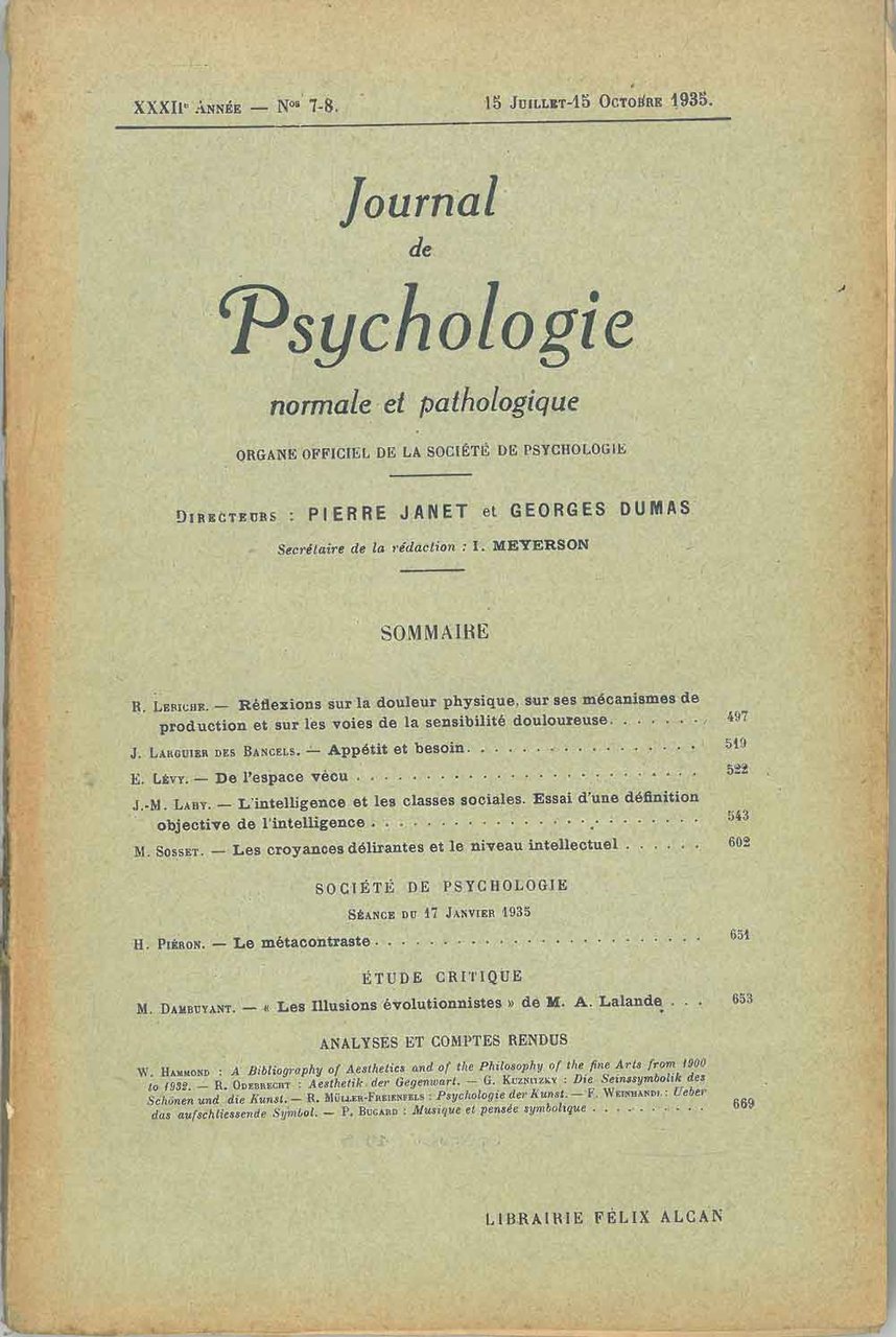 Journal de psychologie normale ed pathologique. Organe officiel de la société de psychologie. XXXII° année, n° 7-8, juillet-octobre 1935 Direttori: Pierre Janet e Georges Dumas