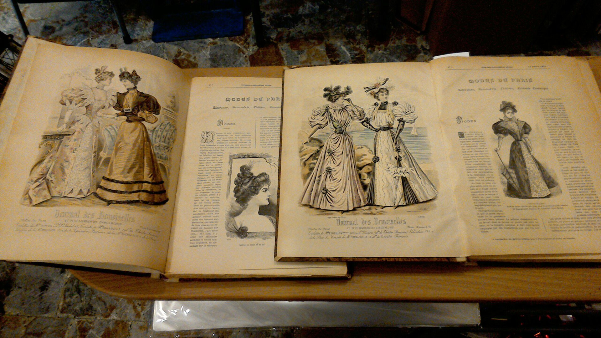 Raccolta dei 40 numeri della rivista "Journal des demoiselles" ( rivista femminile di moda, curiosità, indovinelli, letteratura e bon ton ) dell'anno 1894. Conservati alcuni patrons per la realizzazione di modelli. Lingua francese.