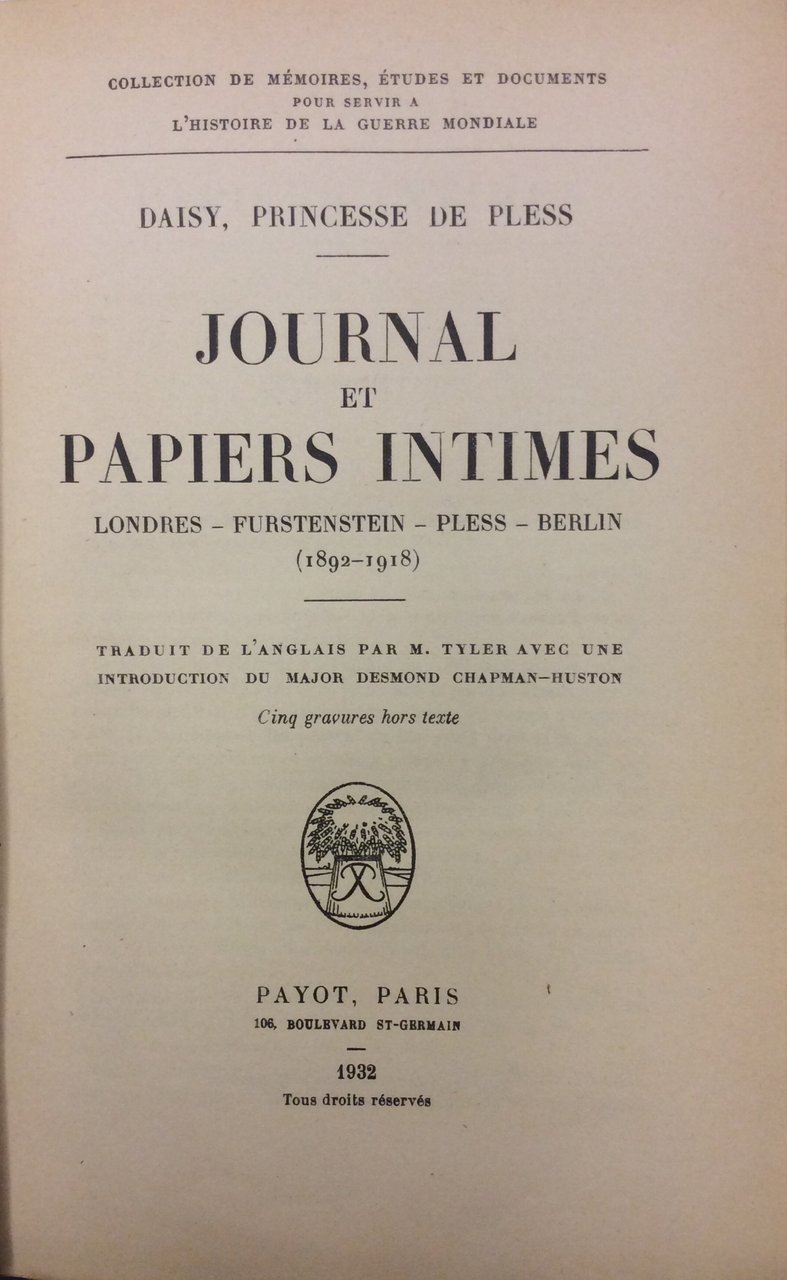 JOURNAL ET PAPIERS INTIMES. LONDRES - FURTENSTEIN - PLESS - BERLIN (1892-1918). - Traduit de 'anglais par M. Tyler. Avec une introduction du Major Desmond Chapman-Huston. Collection de Memoires, Etudes et Documents pour servir a' l'Histoire de la Guerre Mondiale.