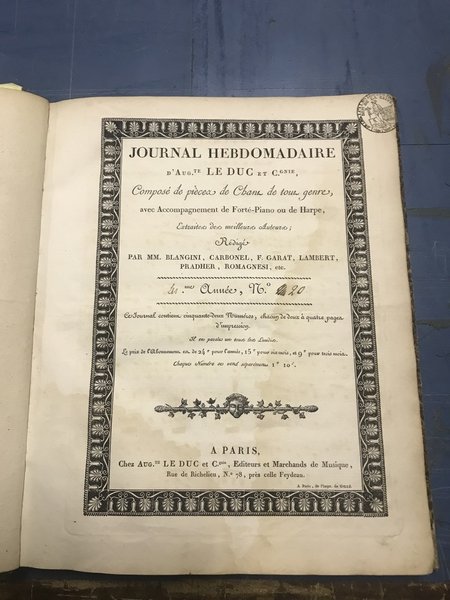 Journal hebdomadaire, composé de pieaces de Chant de tous genre, Trois romances dediees a Mademoiselle Elvire De Salis Samade par Lambert. (vedi testo) 41 anne n. 20